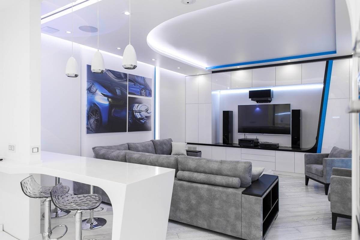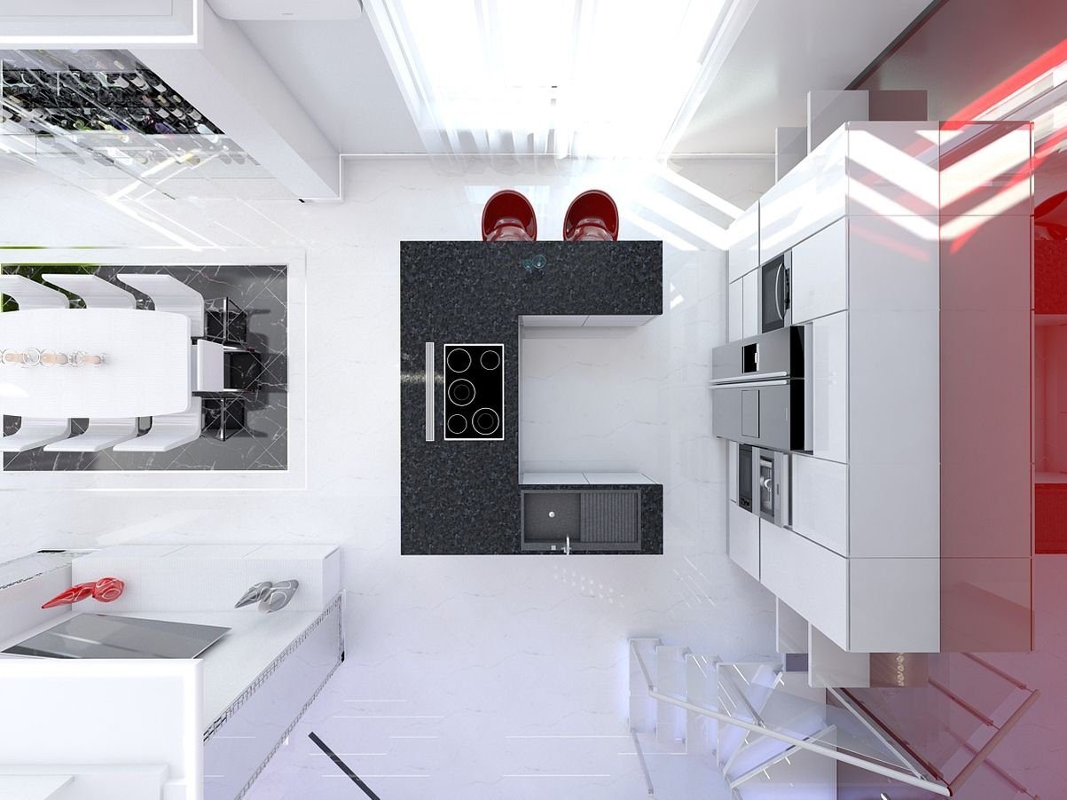 Интерьер кухни- гостиной бело черного цвета в стиле Хай тек
