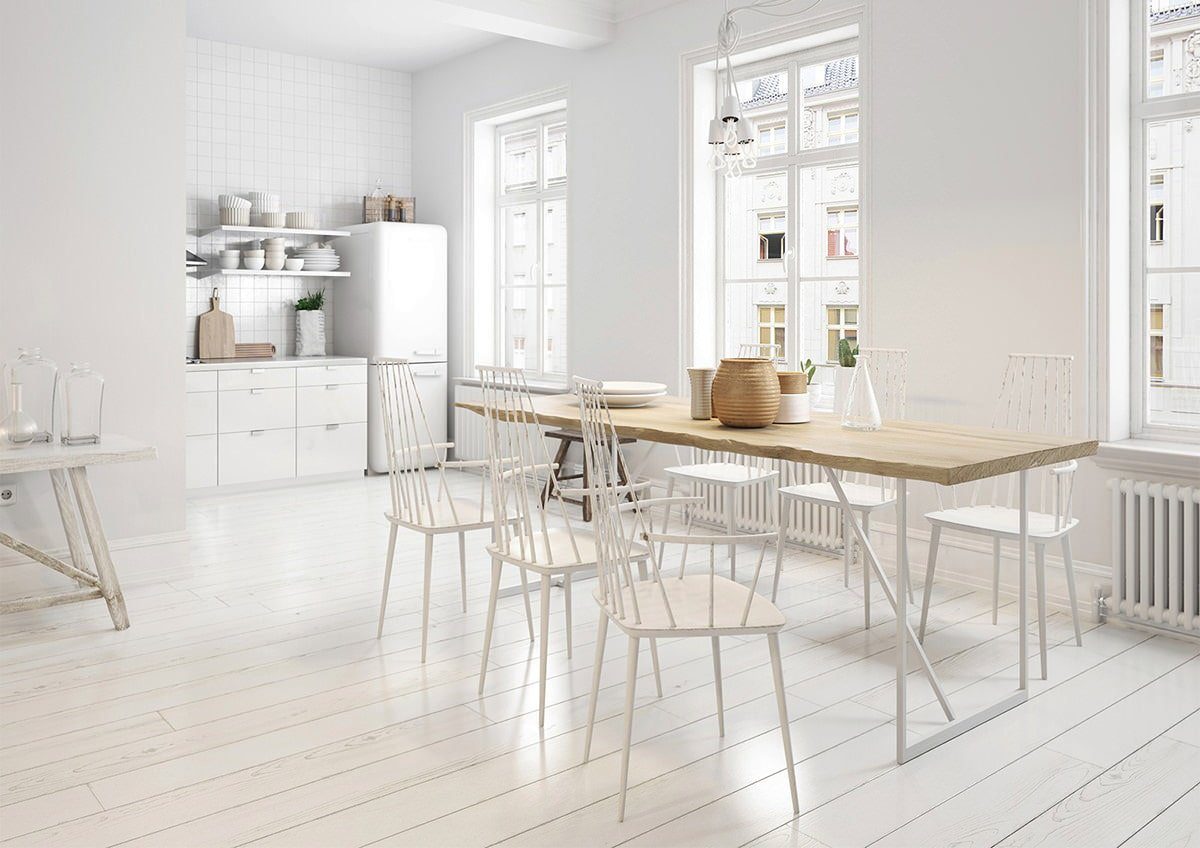 Белый стол на кухне с серой плиткой на полу
