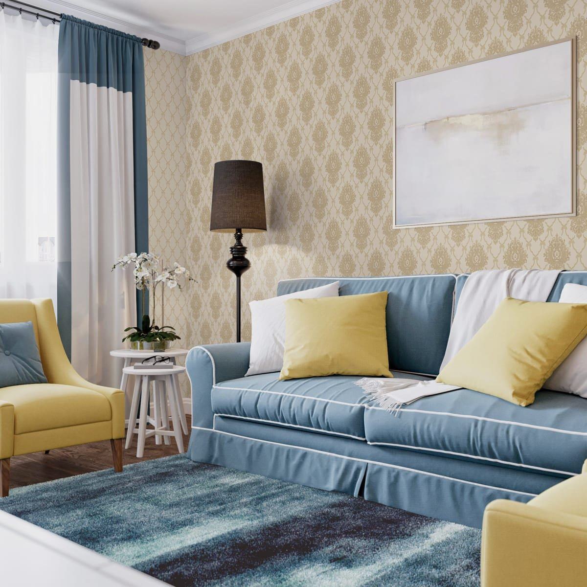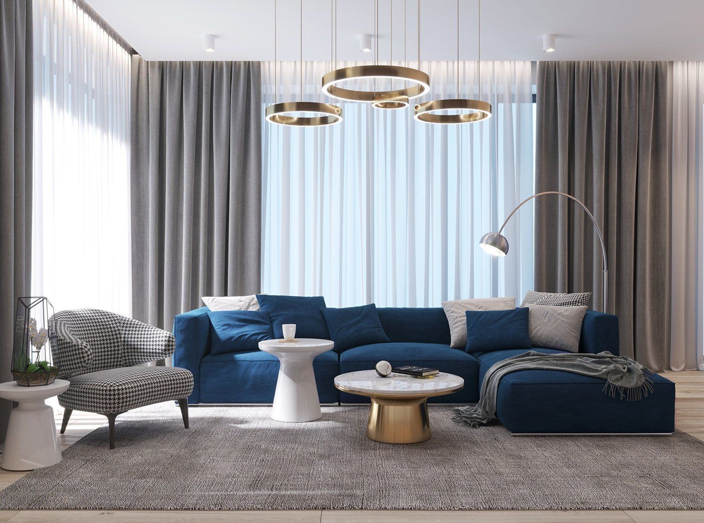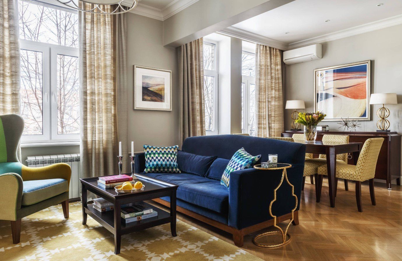 Интерьер гостиной в светлых тонах с яркими акцентами