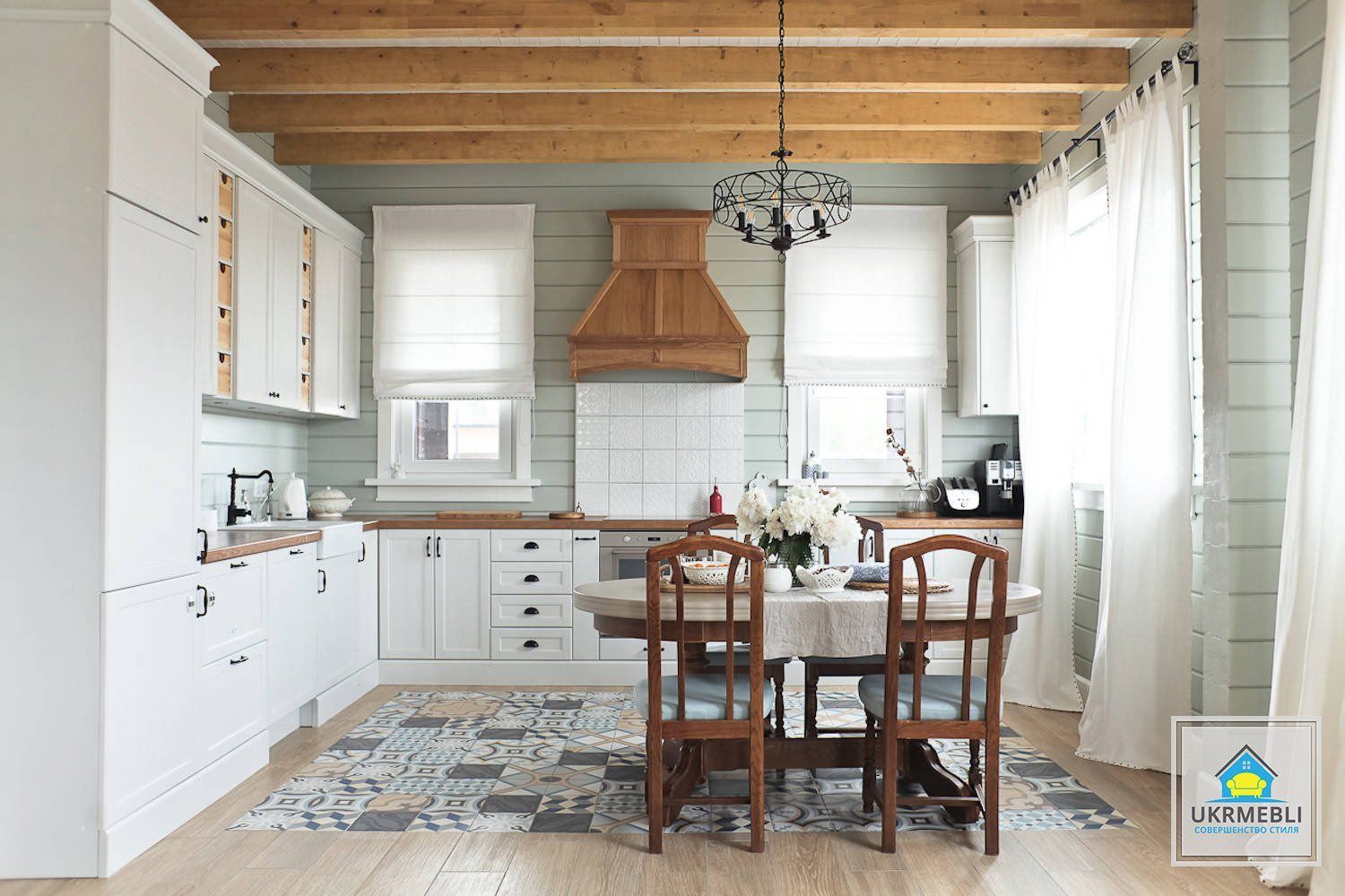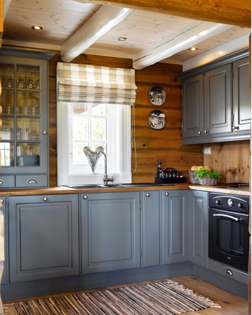 Стиль Прованс деревня в интерьере кухни бревенчатый дом зелёный шкаф