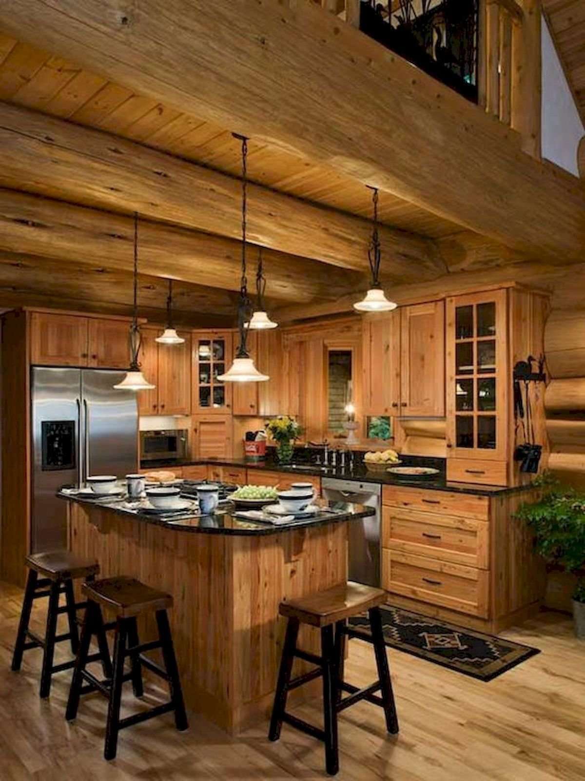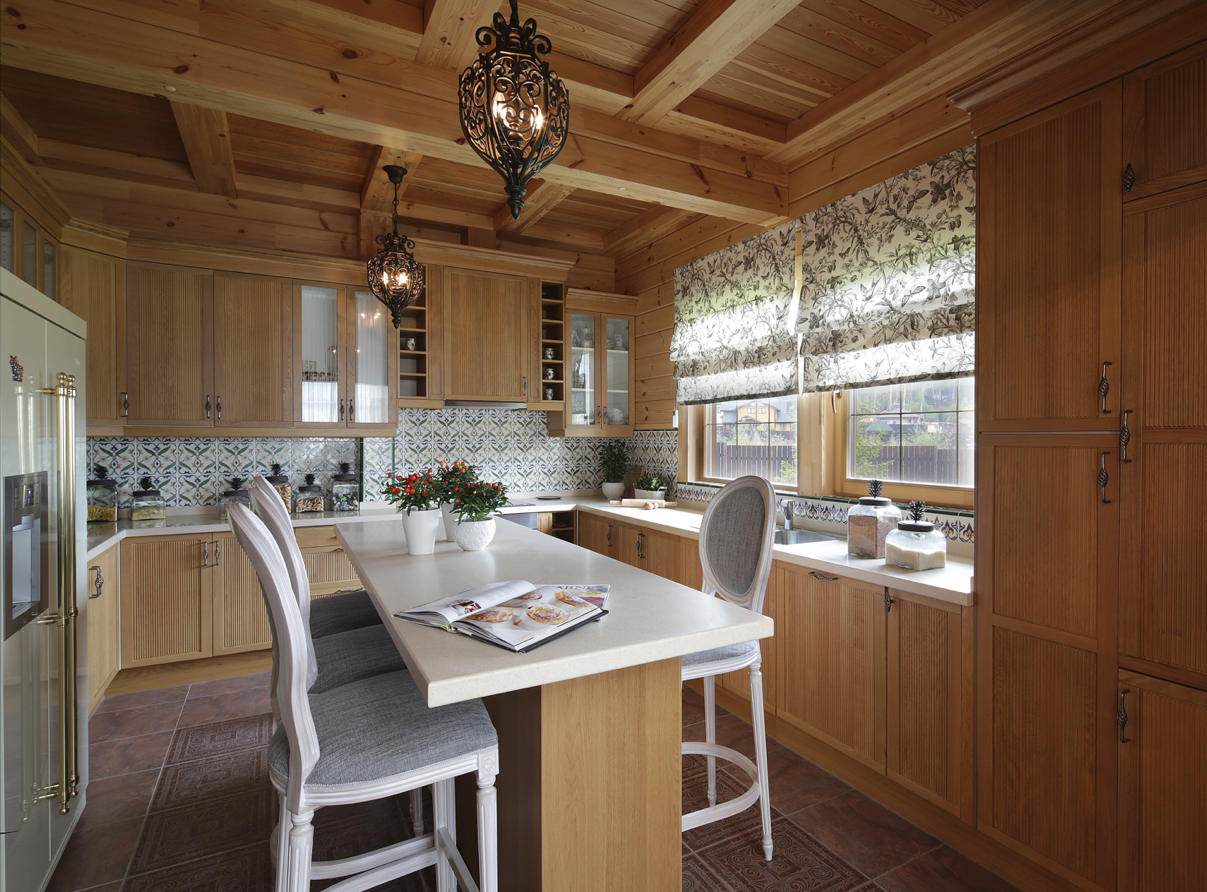 Интерьер кухни в деревянном доме из оцилиндрованного бревна