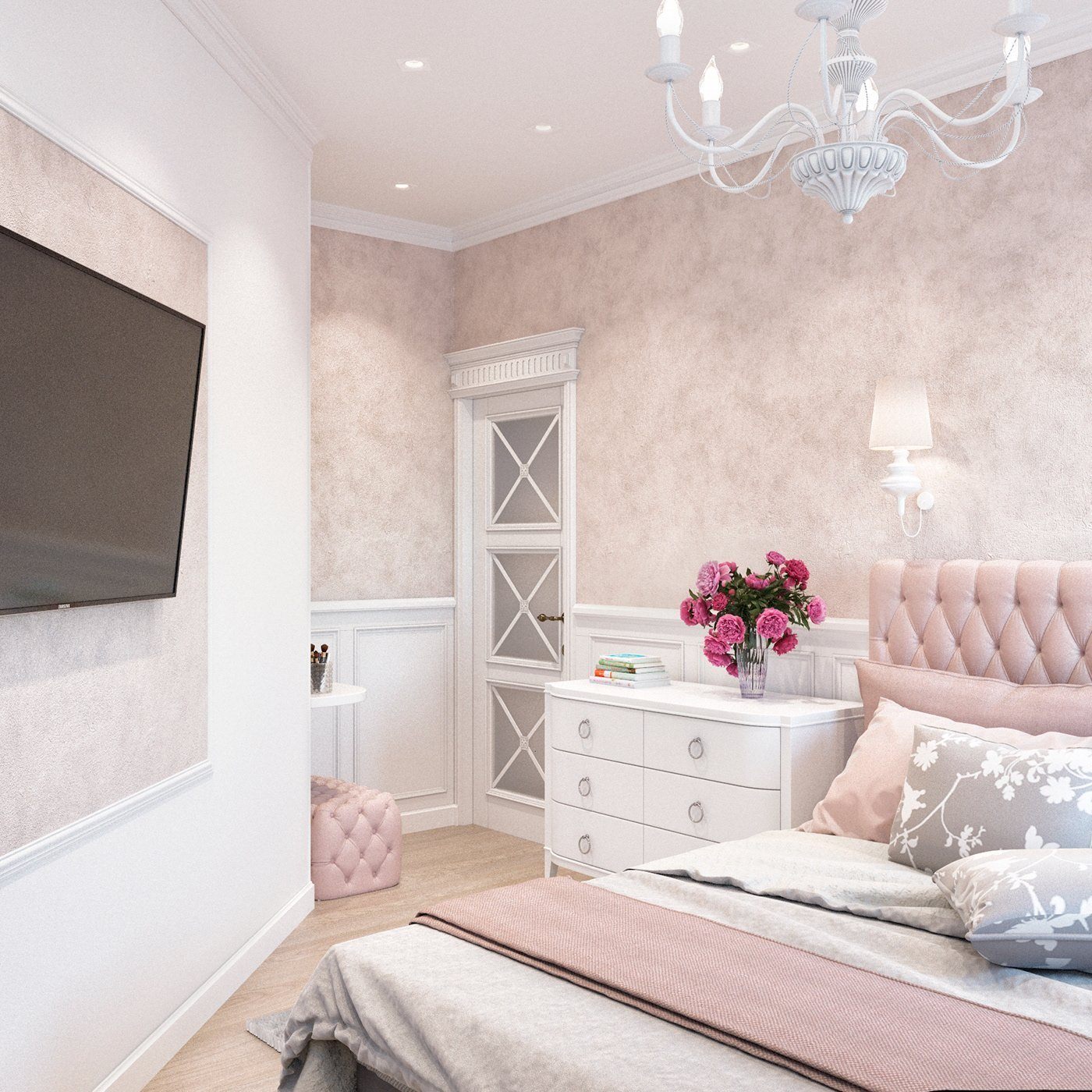 Интерьер спальни в современном стиле без окна в пудровых тонах