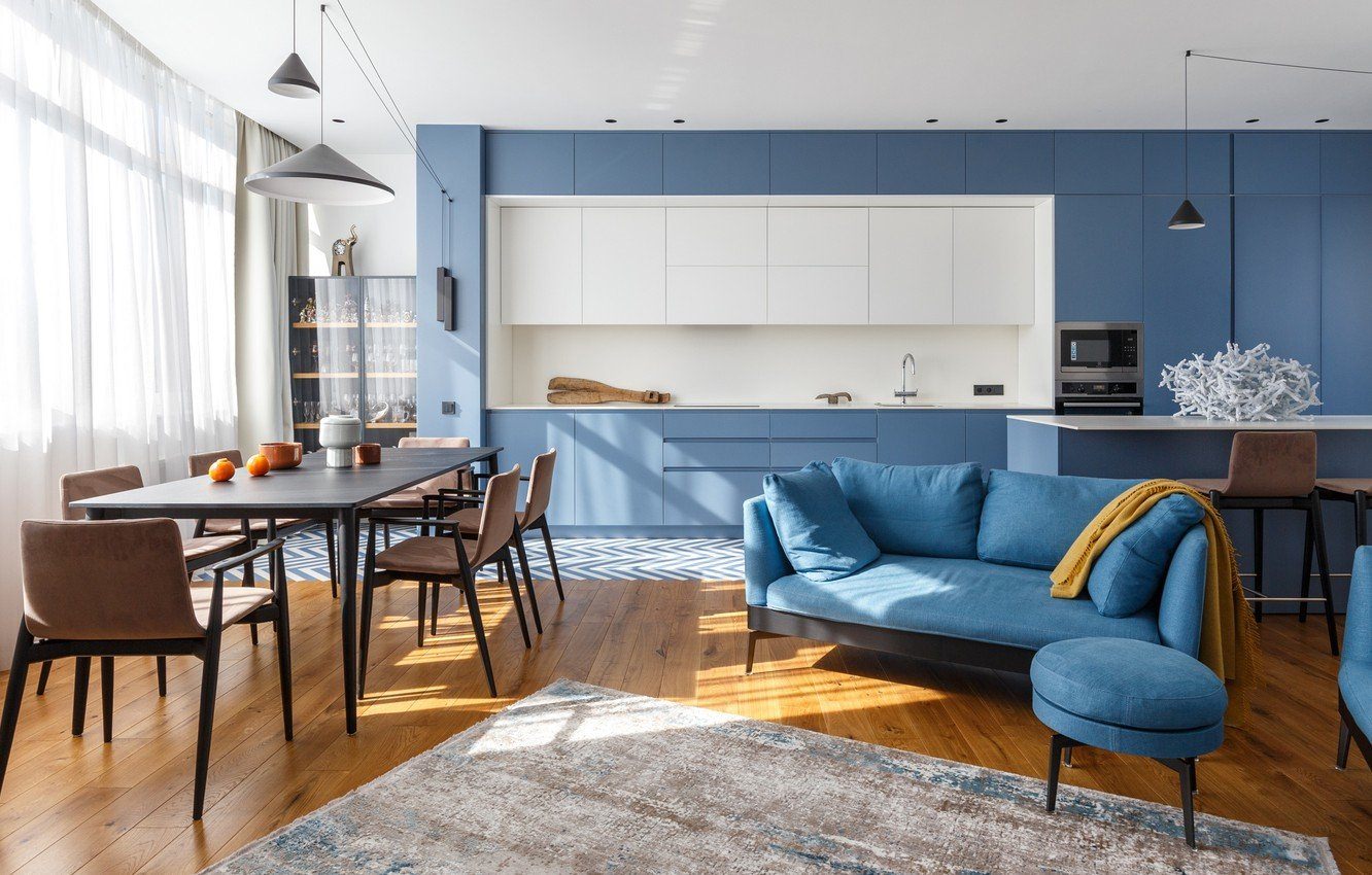 Дизайн кухни гостиной 15 кв.м с синим диваном