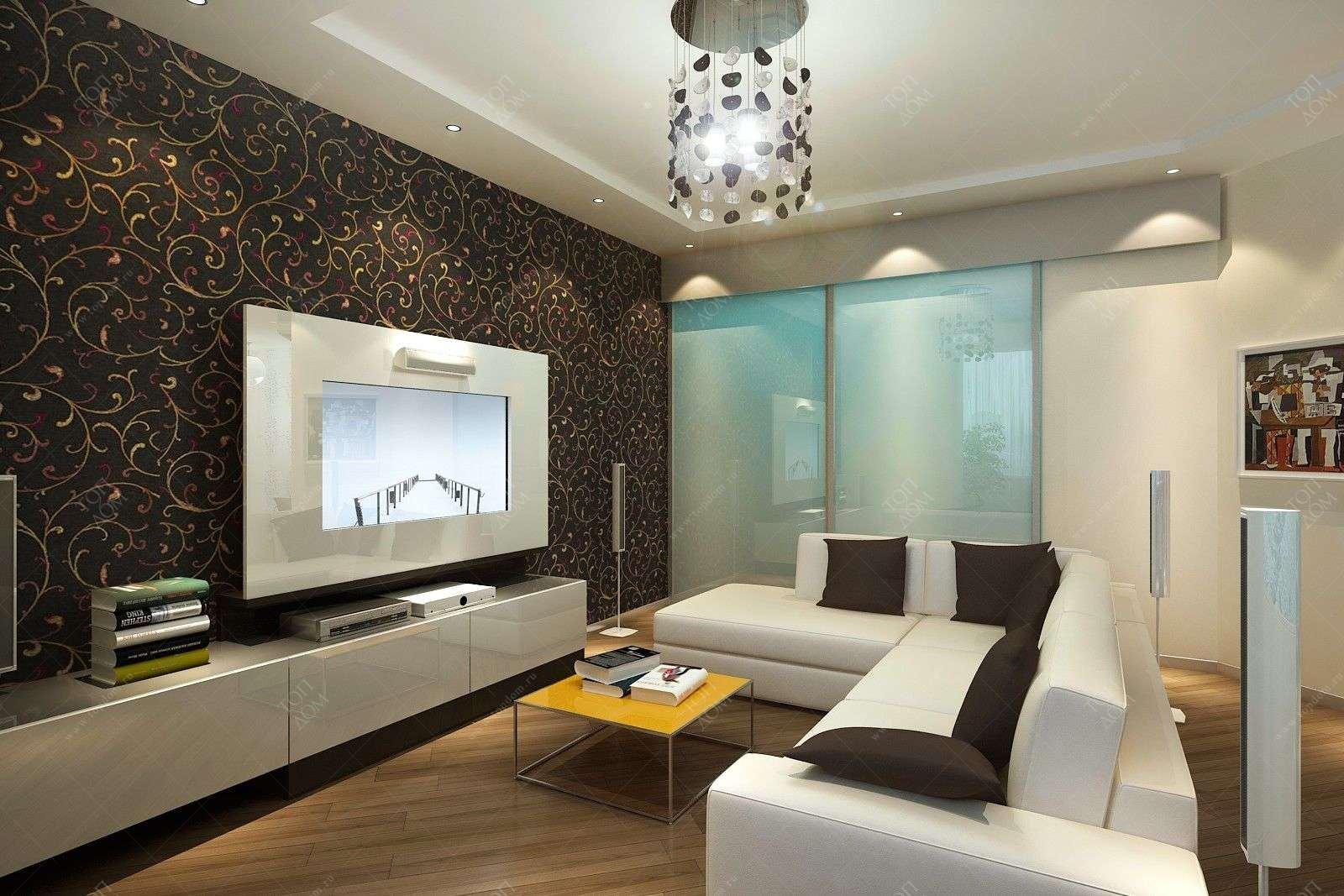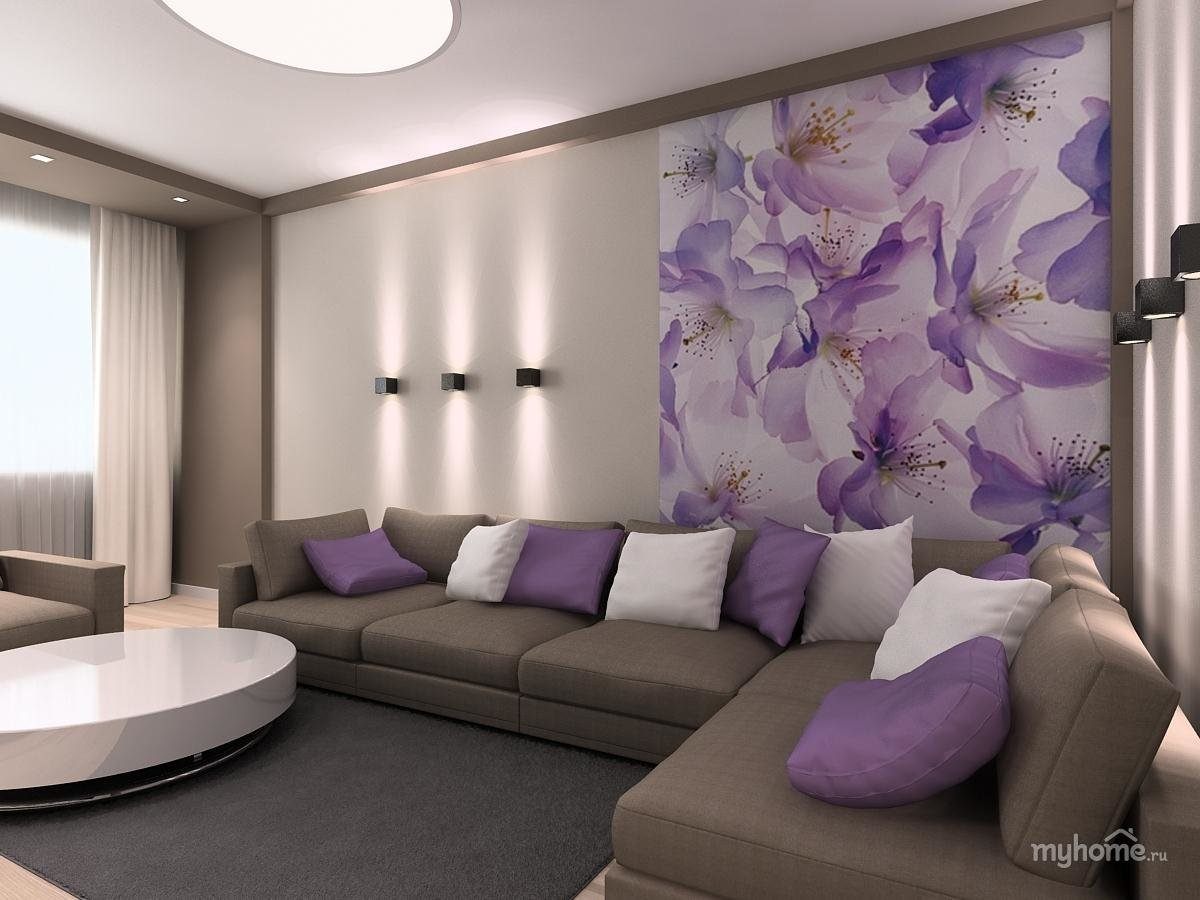Гостиная с 2 окнами на одной стене с акцентной стеной за диваном