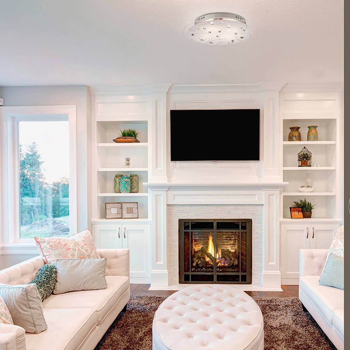 Комната с камином и белой мебелью