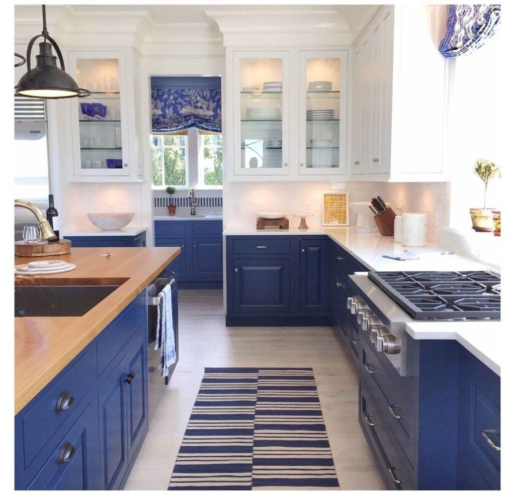 Синяя кухня с деревянной столешницей