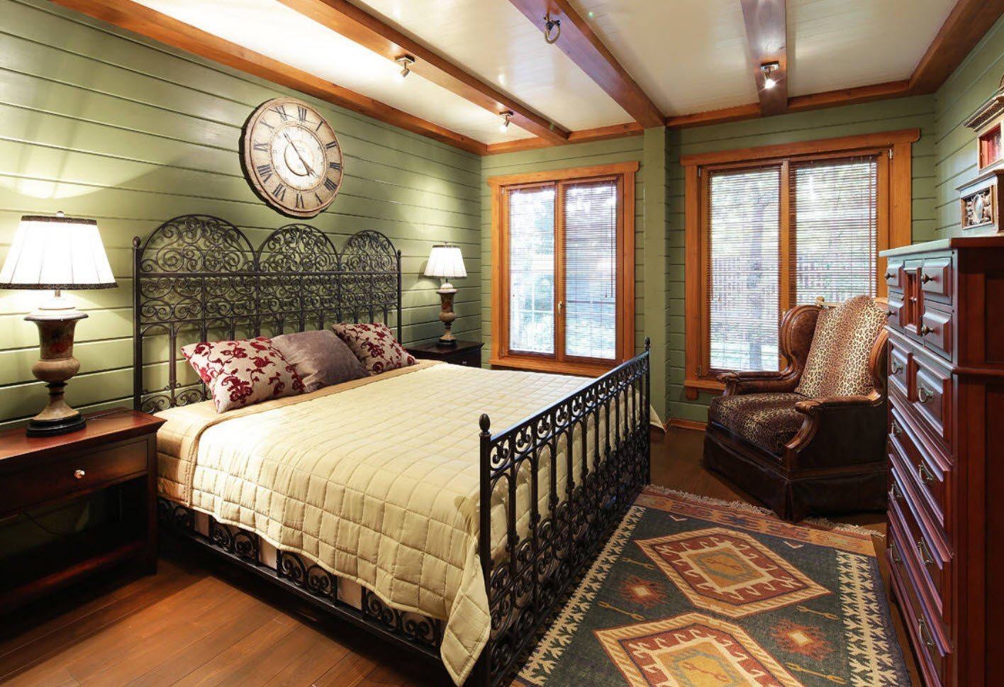Интерьер спальни отделанной имитацией бруса