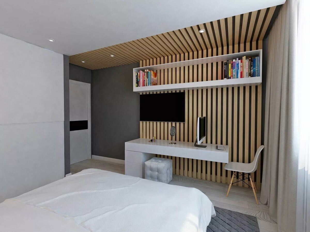 Реечные перегородки для зонирования в интерьере гостиной-спальни