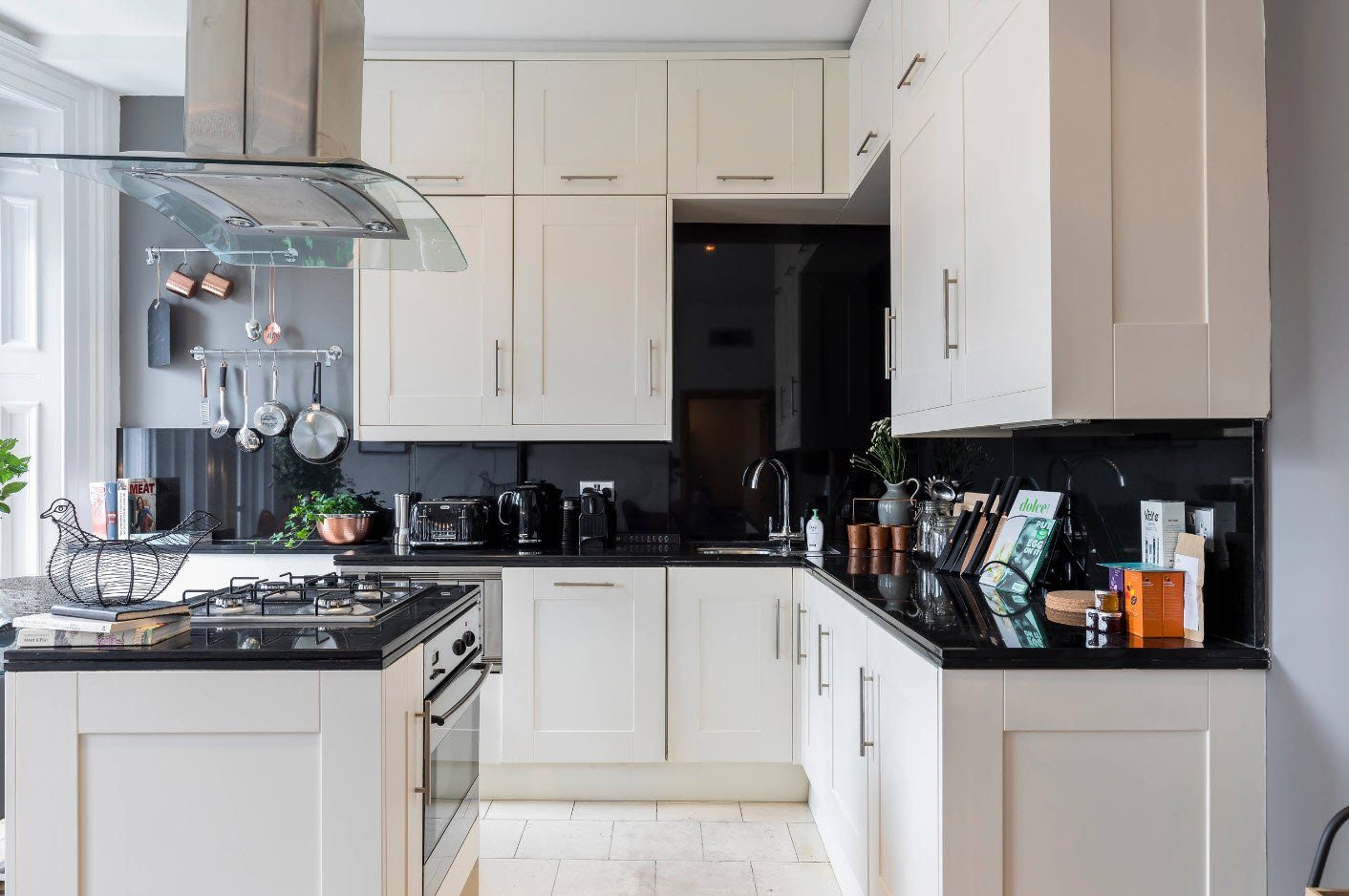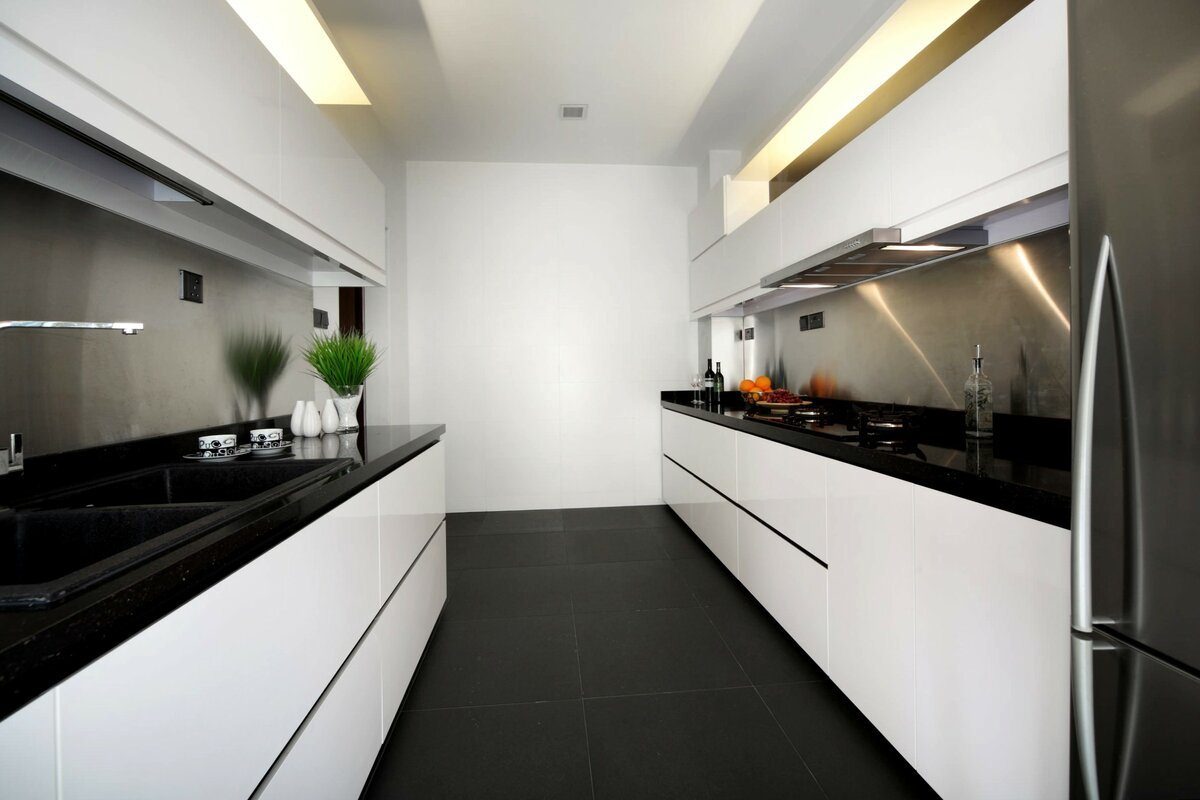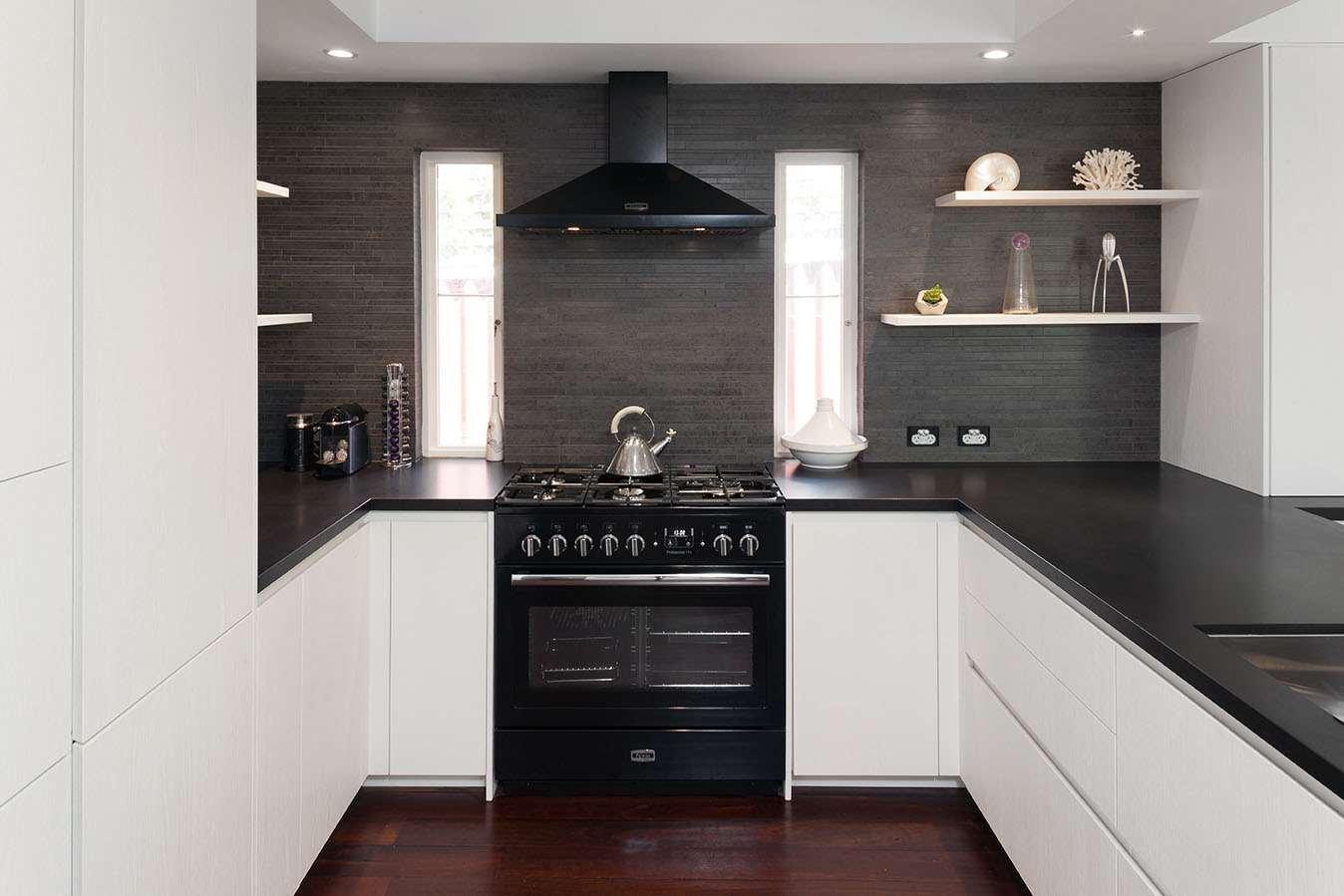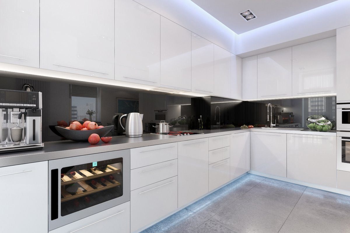 Обои для белой кухни с чёрной столешницей в интерьере фото реальные