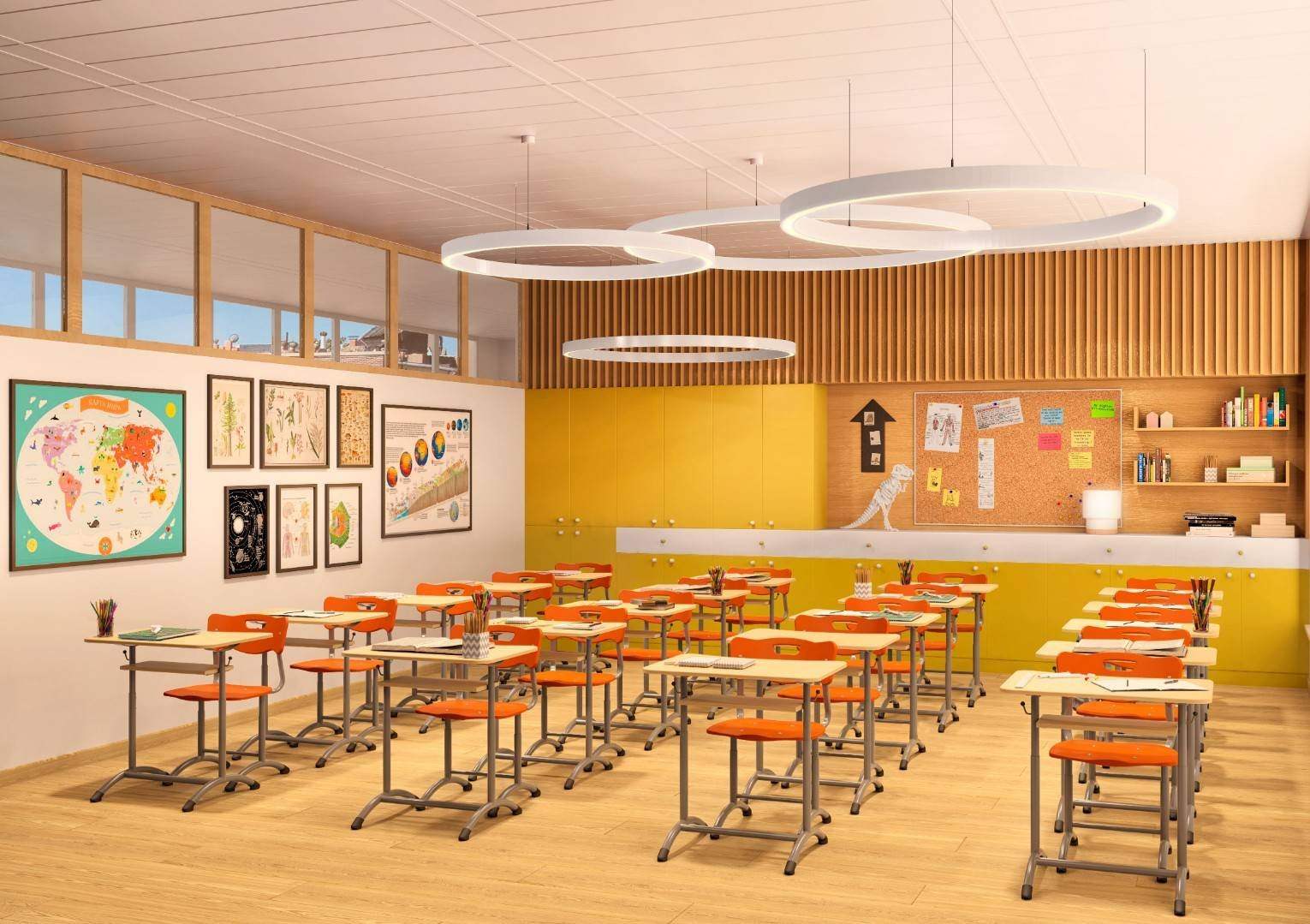 Современный интерьер класса с коричневыми партами