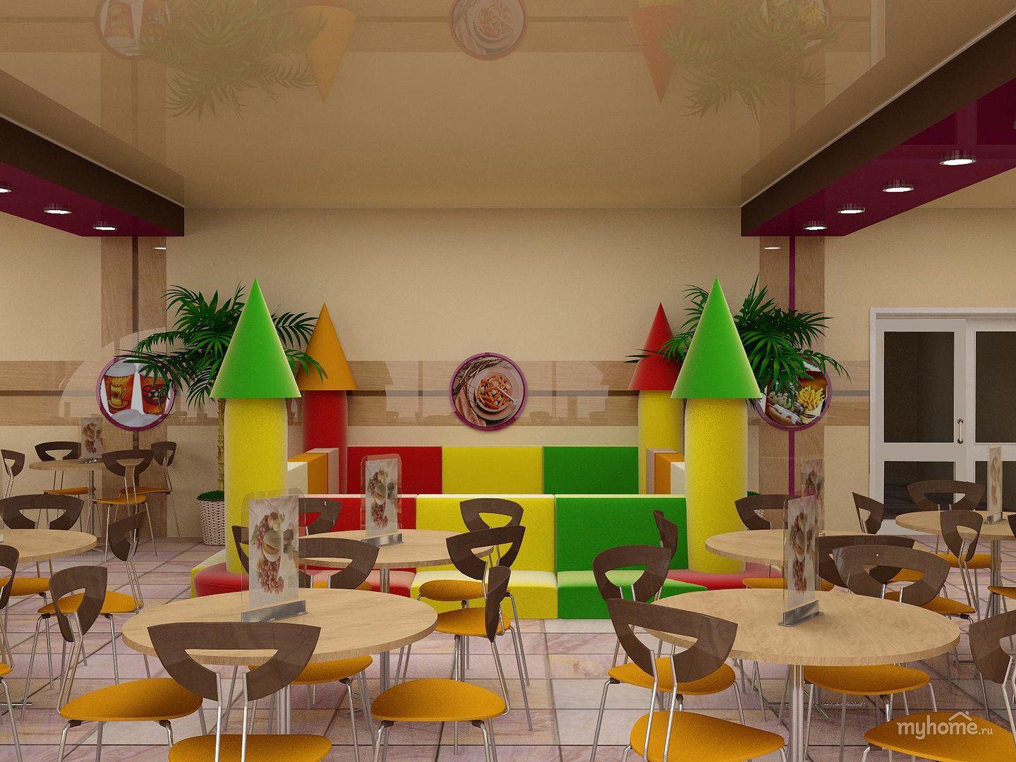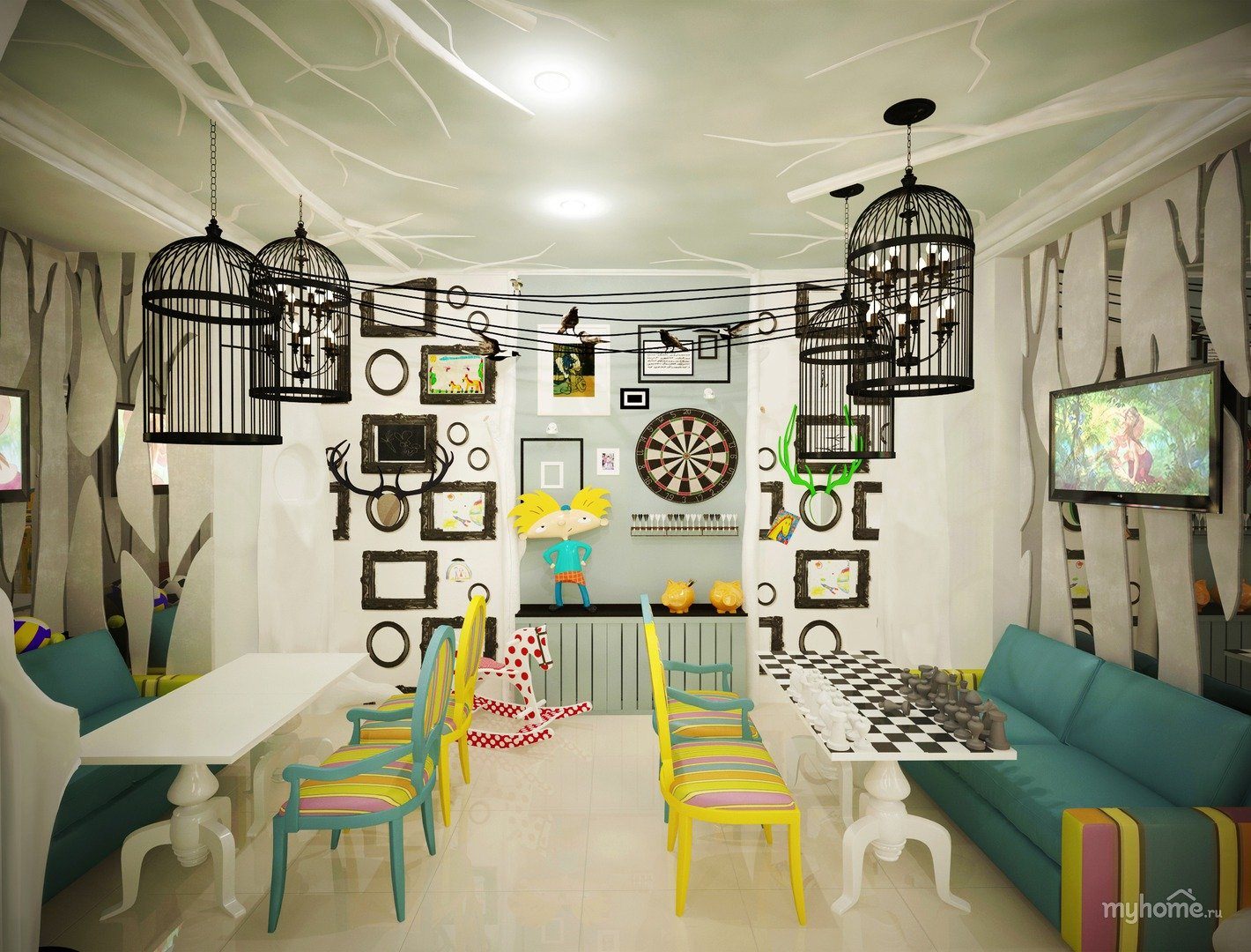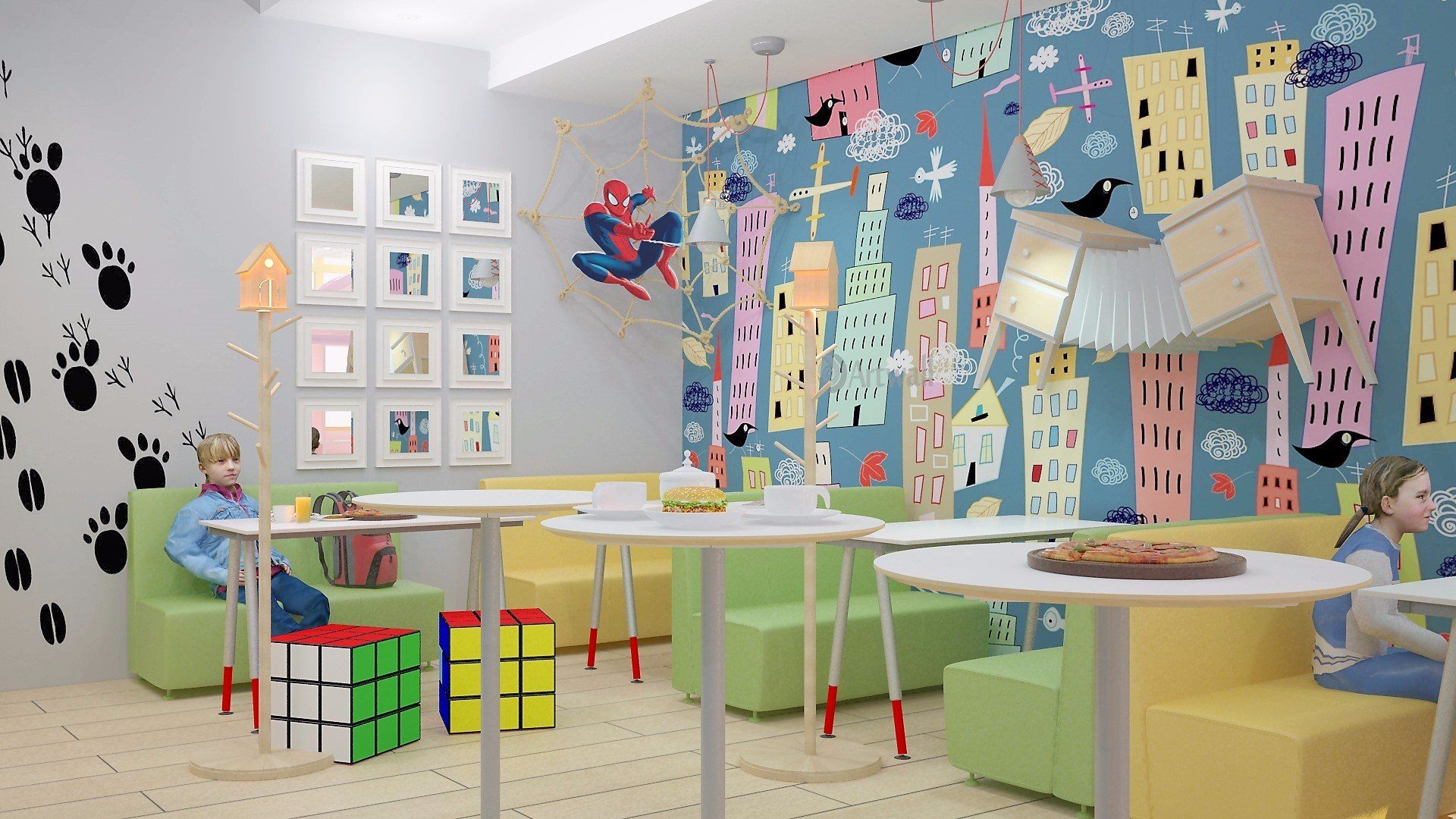 Интерьер детского кафе с двумя окнами бирюзовый горы