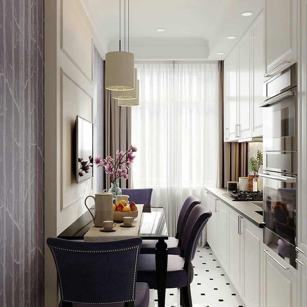 Интерьер узкой прямоугольной кухни