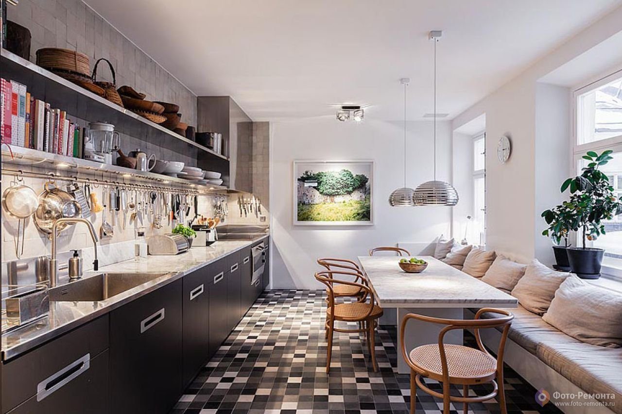 Интерьер узкой кухни 13 кв