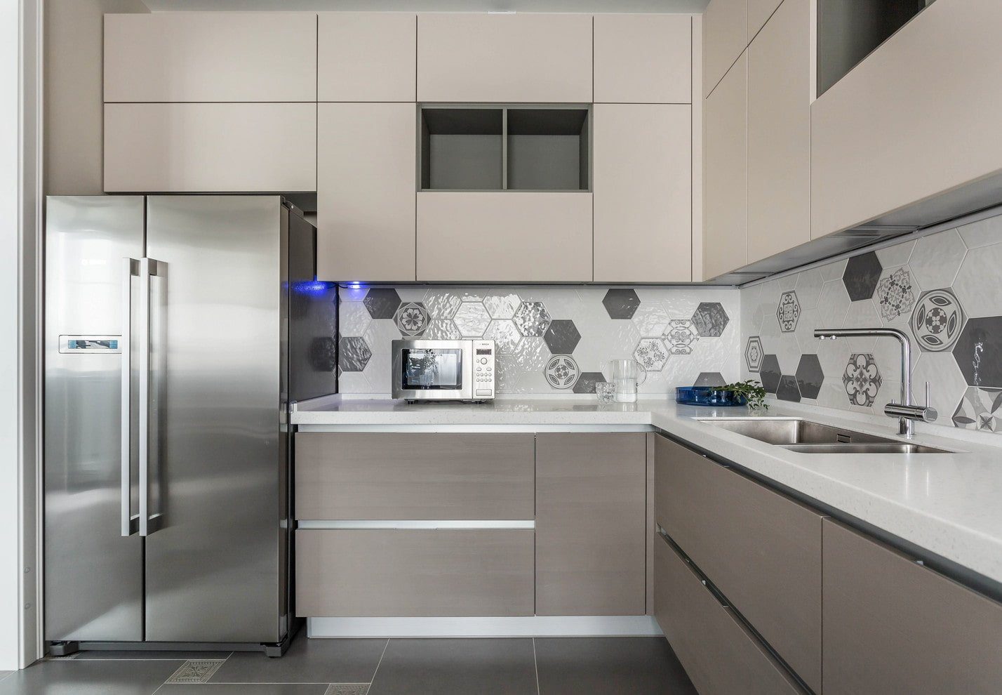 Серая кухня с бежевым фартуком