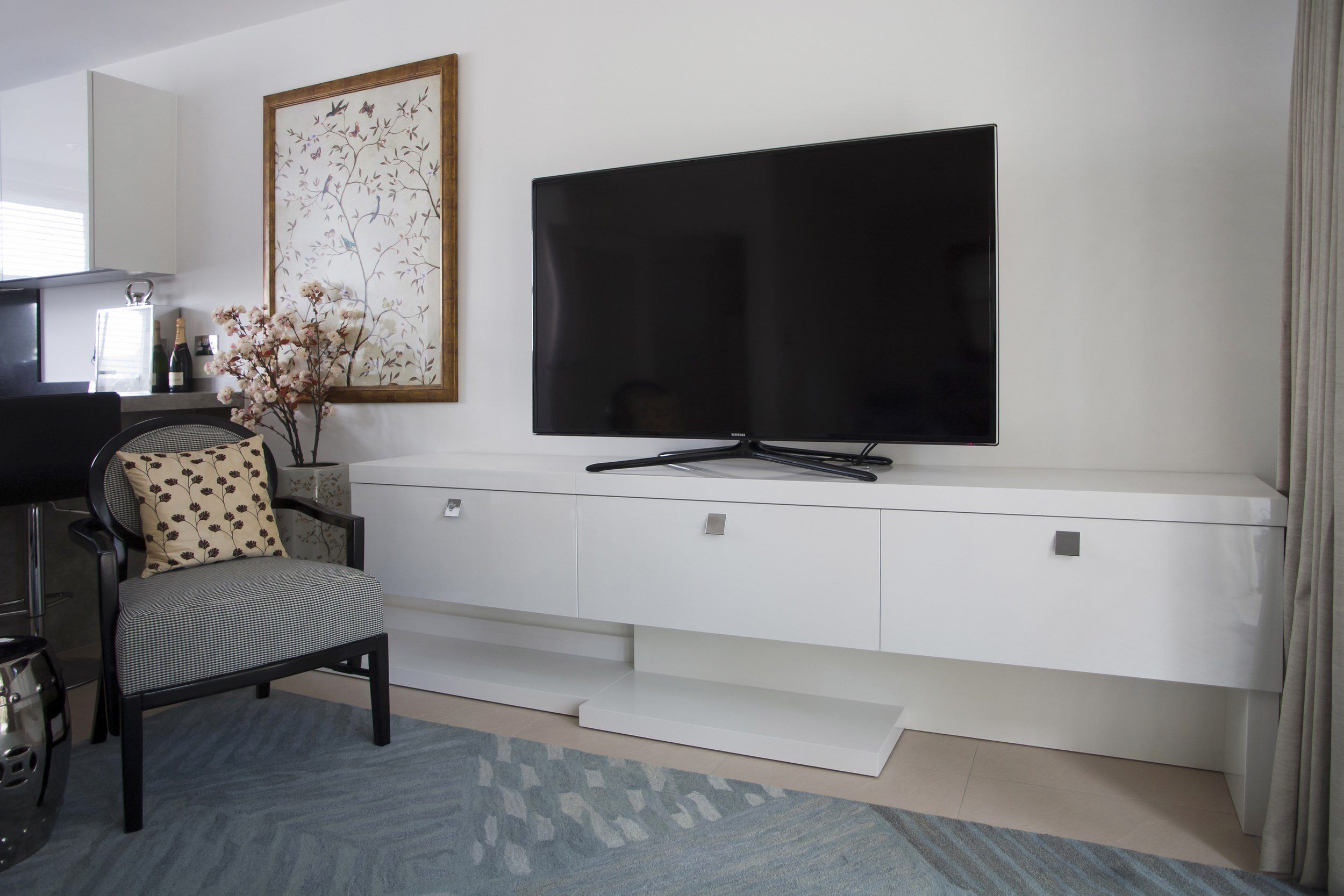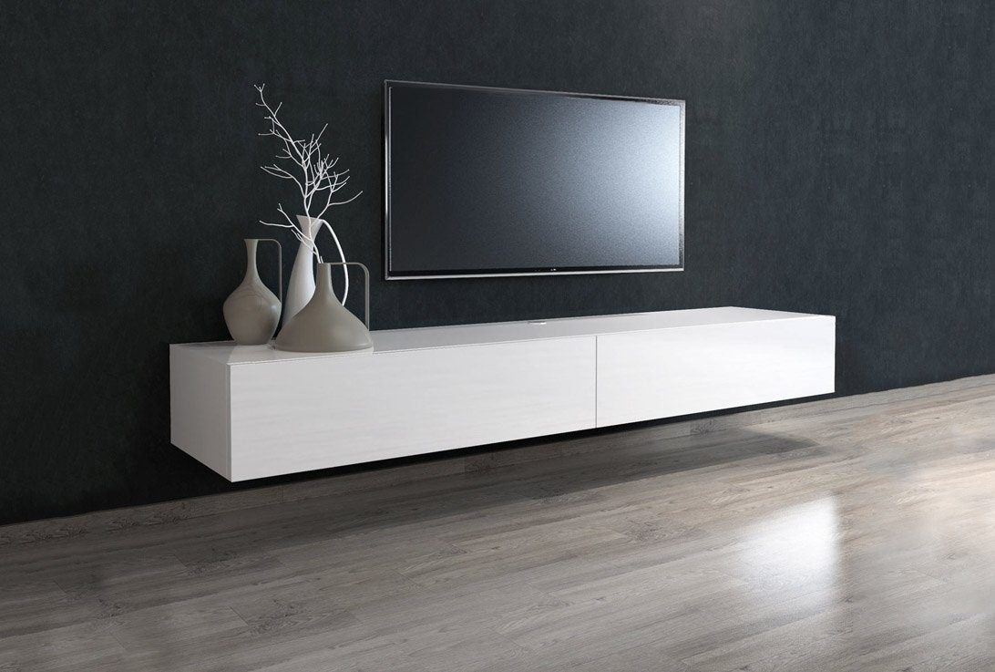 Белая тумба под телевизор на белой стене