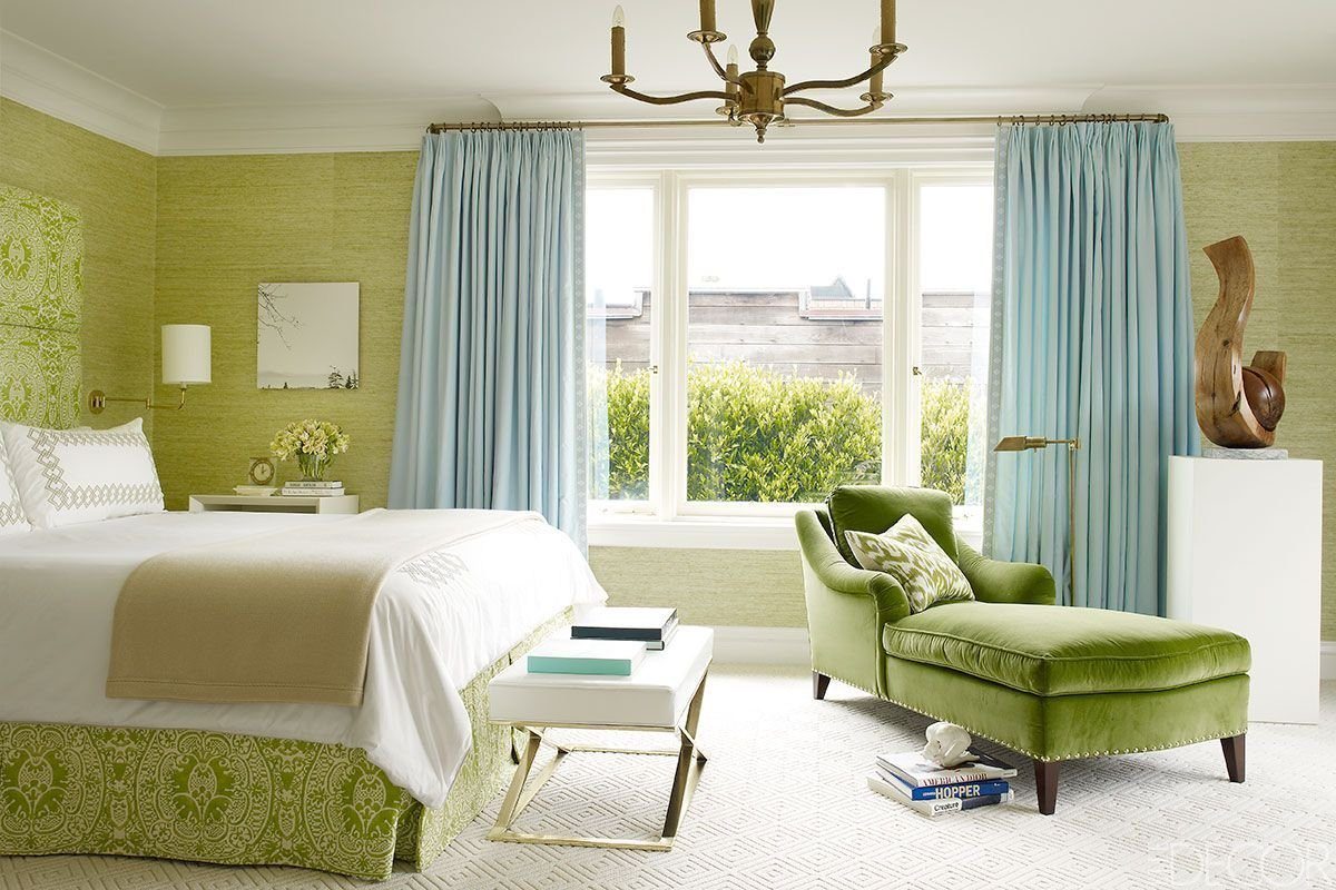 Спальня с зелеными шторами