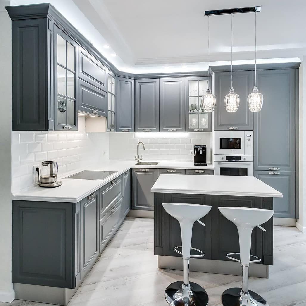 Серая кухня с белой столешницей