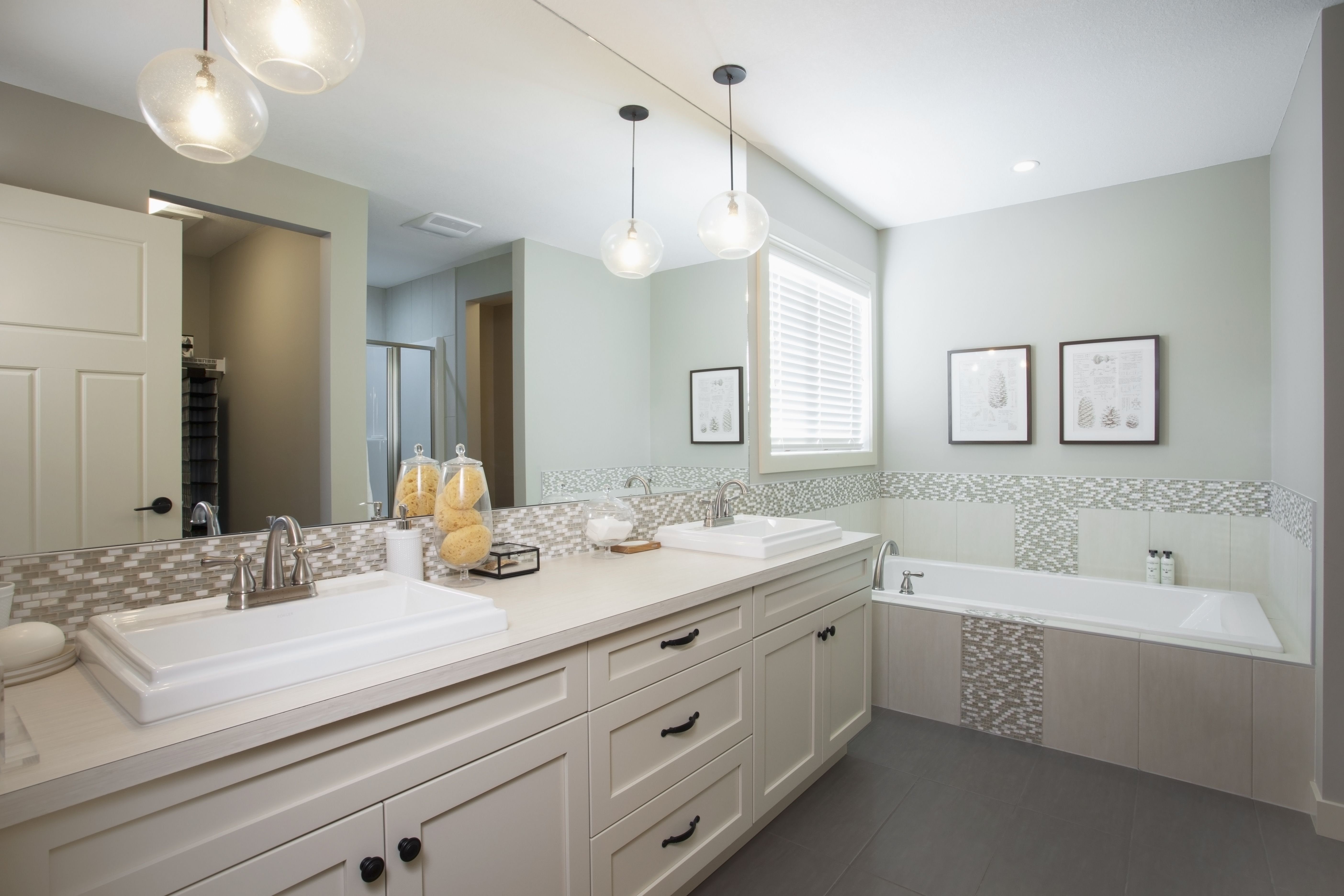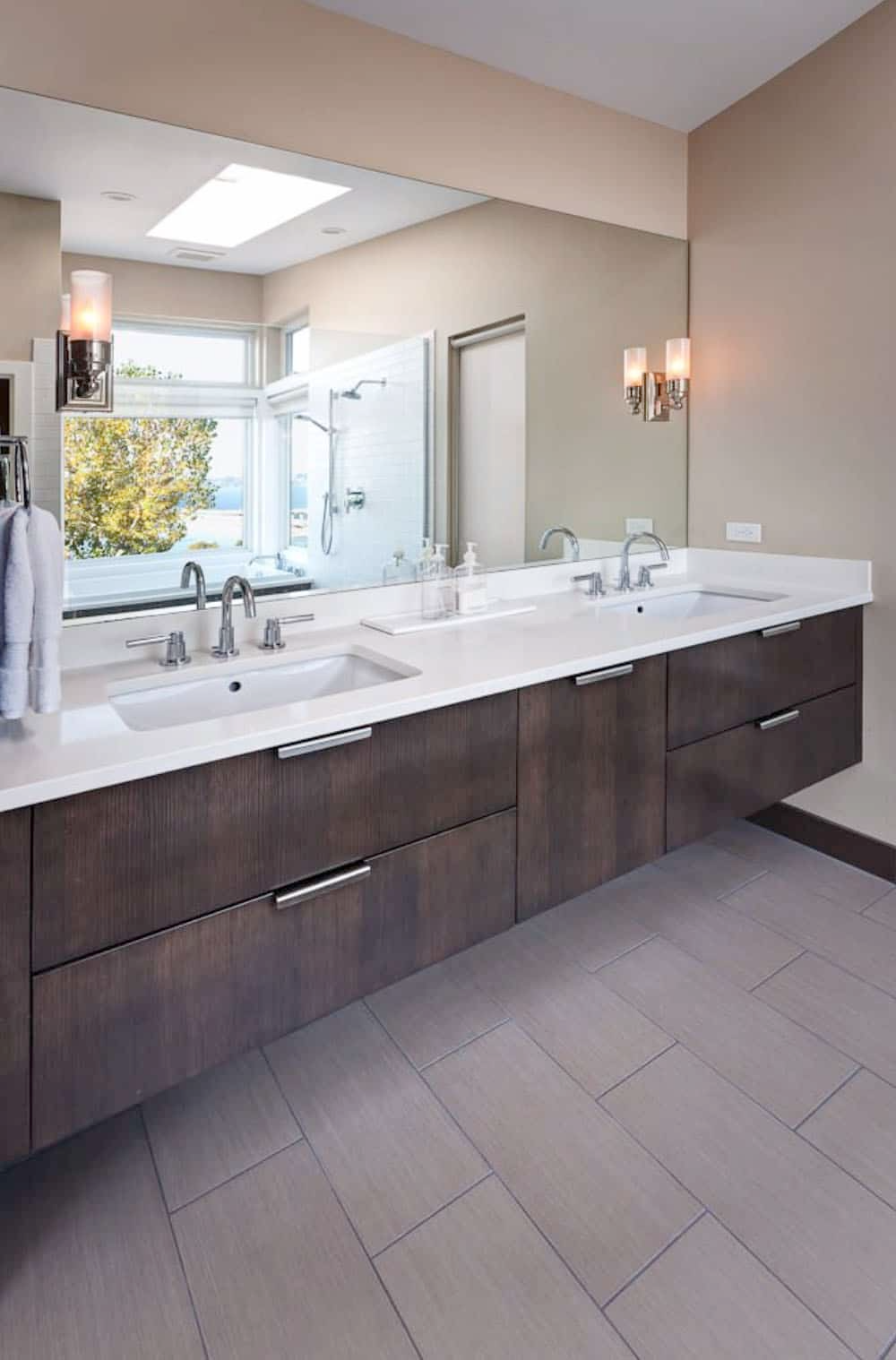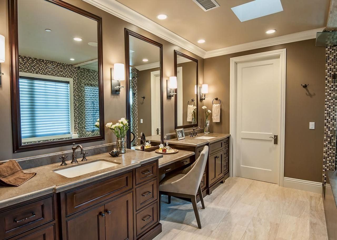 Ванная в доме с двойной раковиной и туалетным столиком посредине