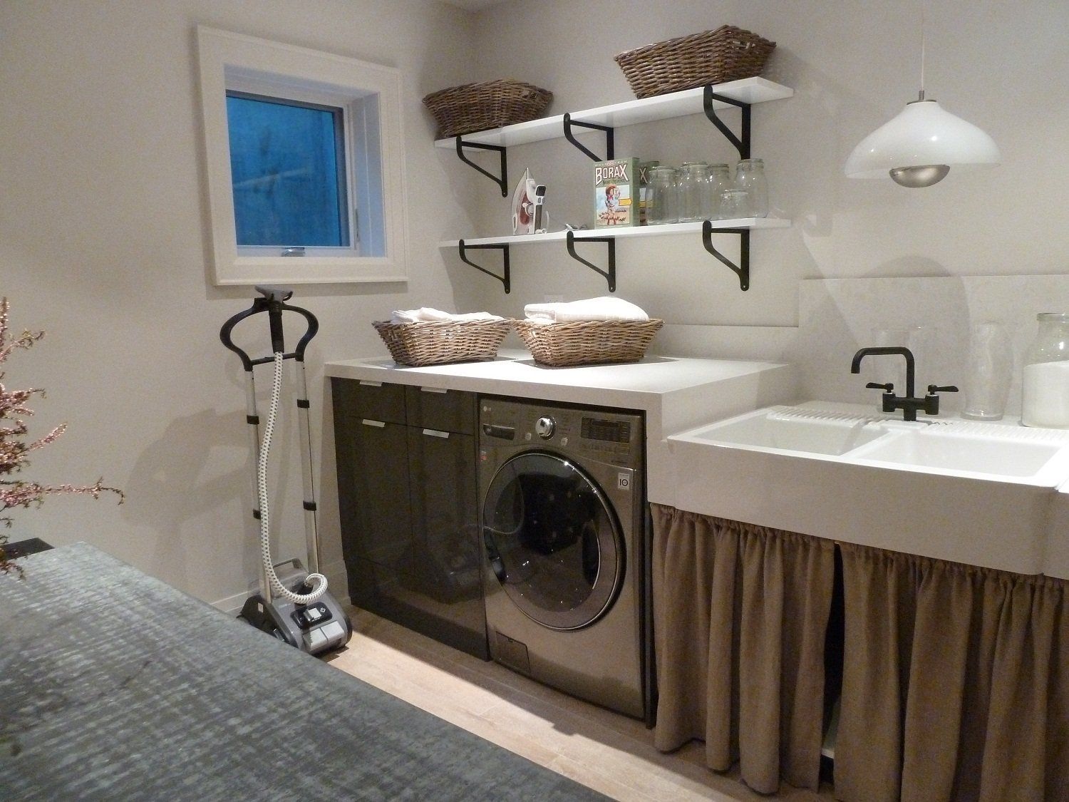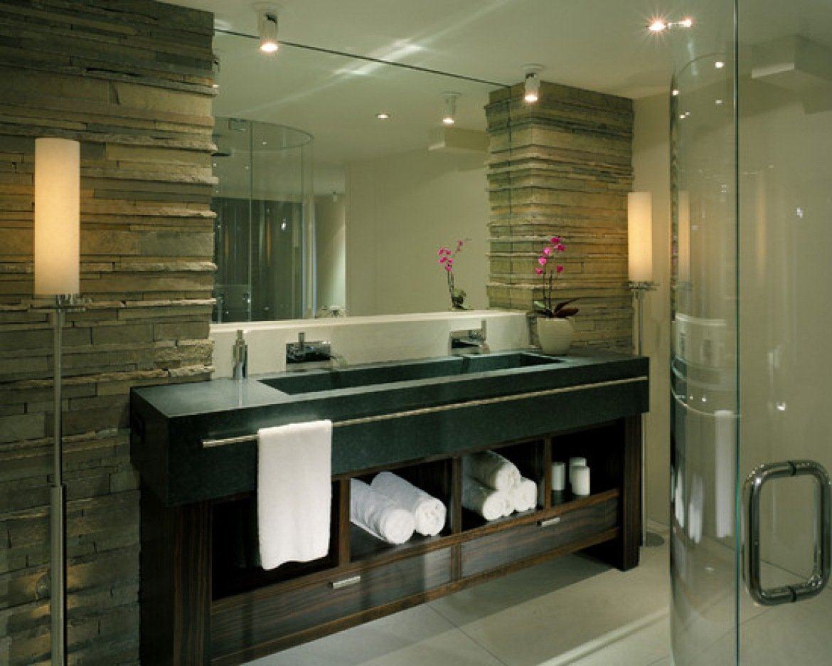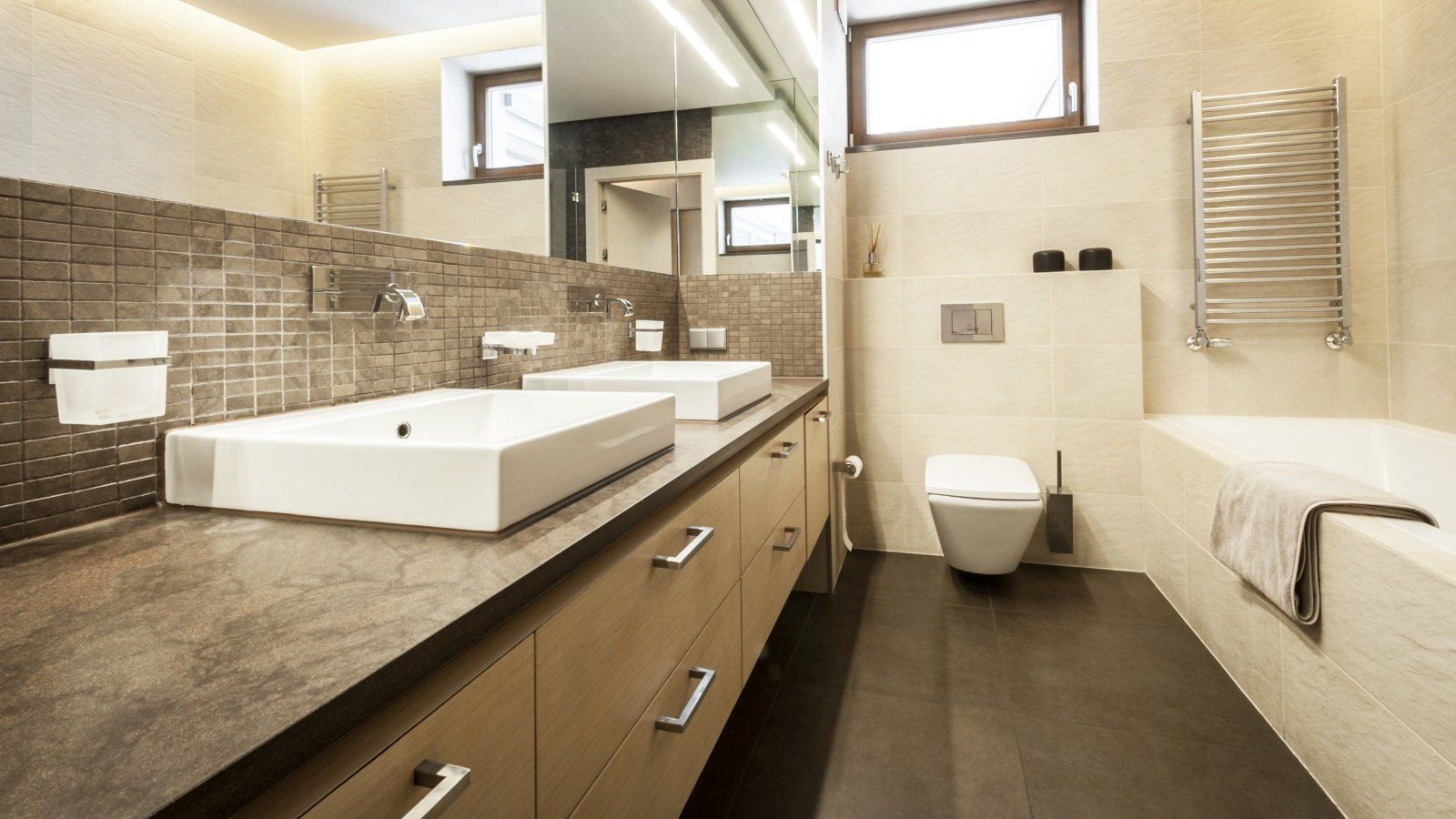 Ванная в доме с двойной раковиной и туалетным столиком посредине