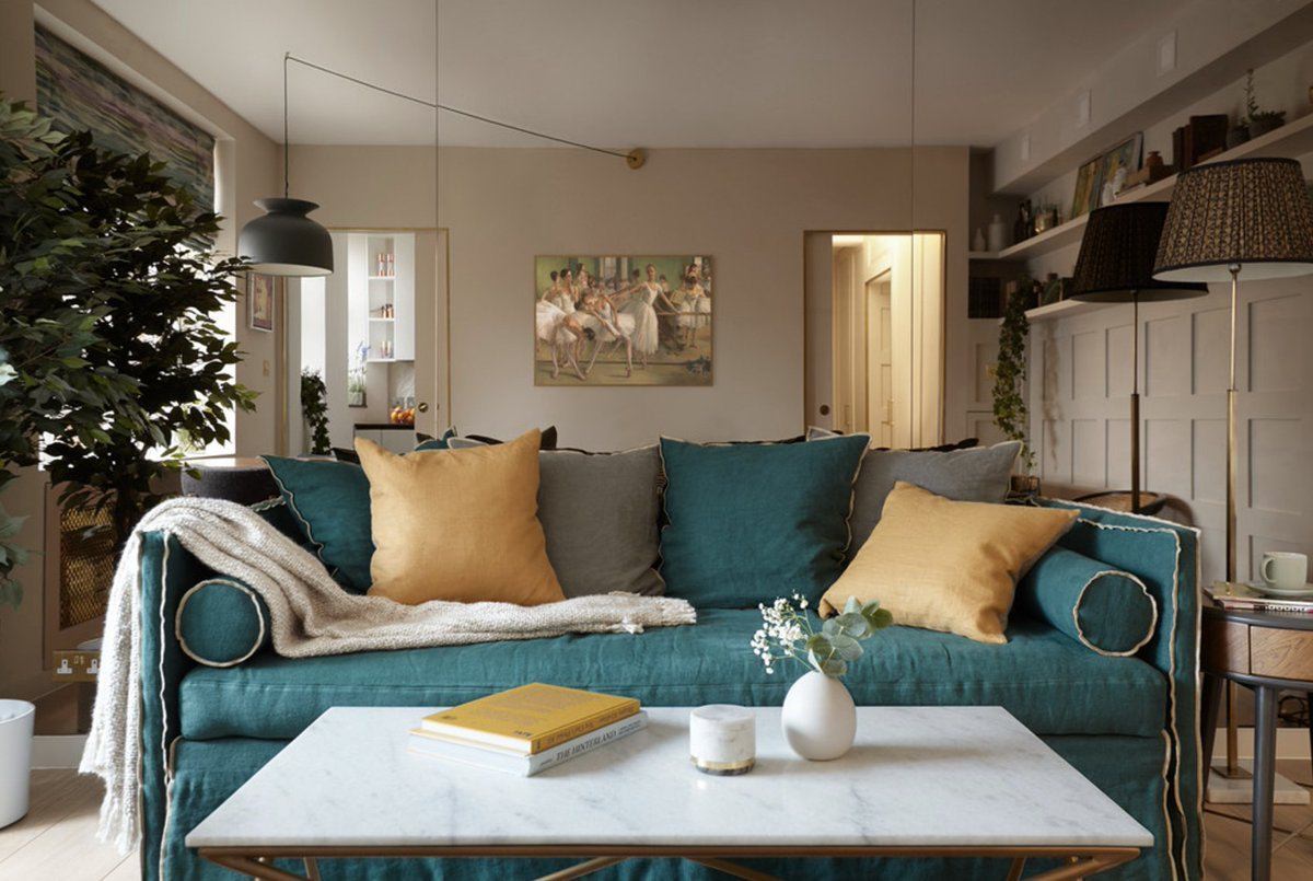 Гостиная с изумрудным диваном