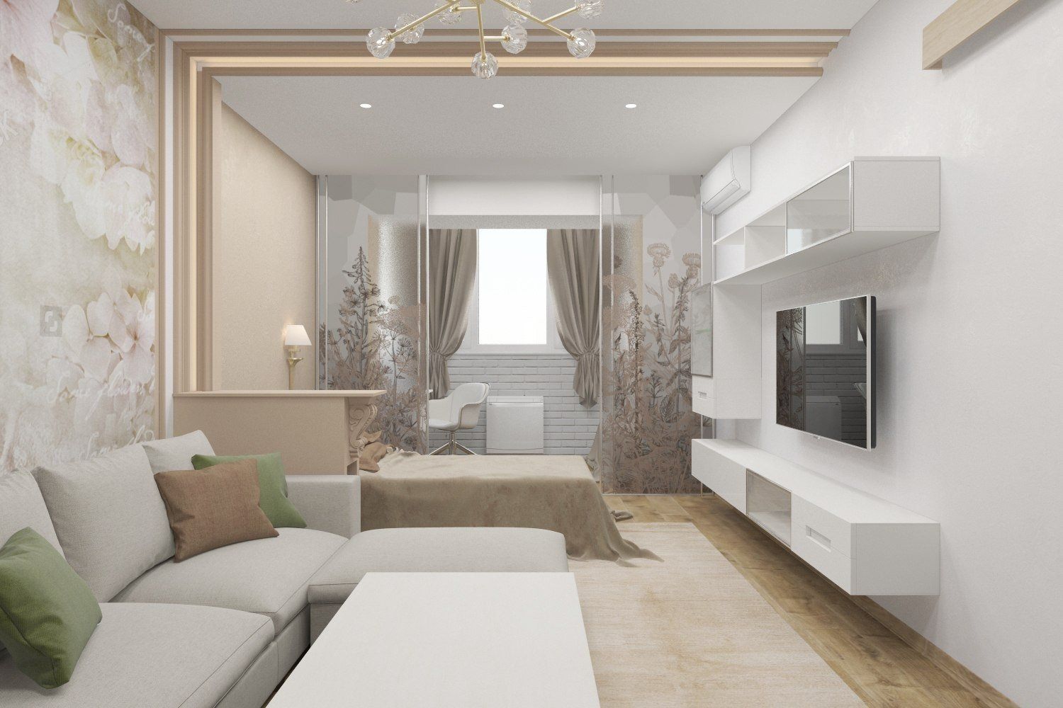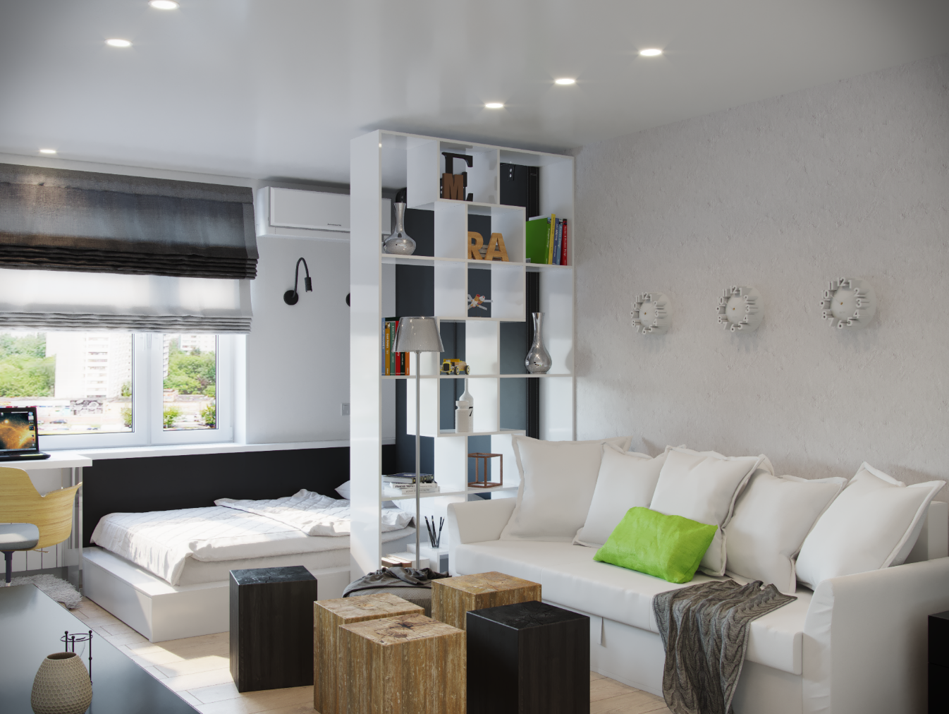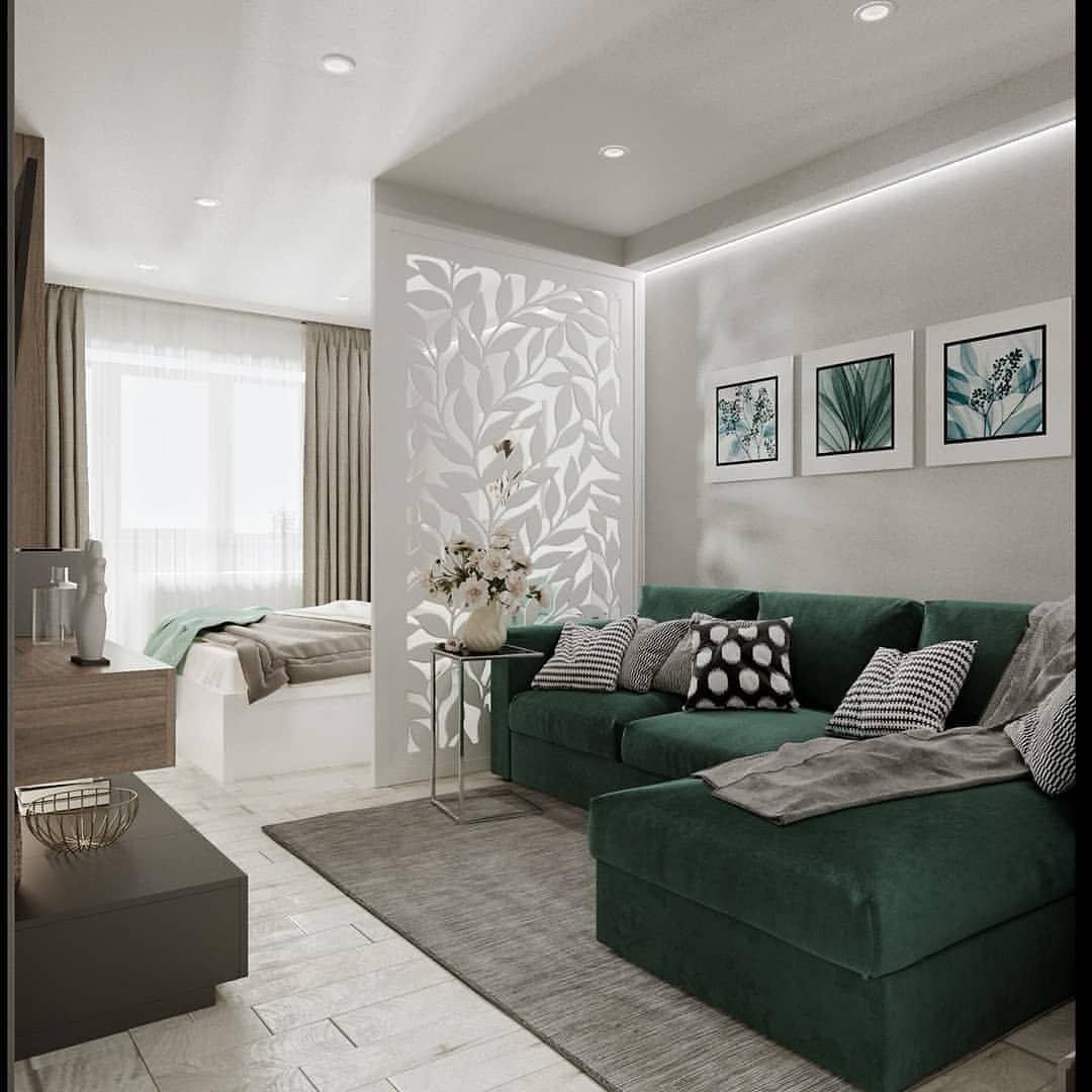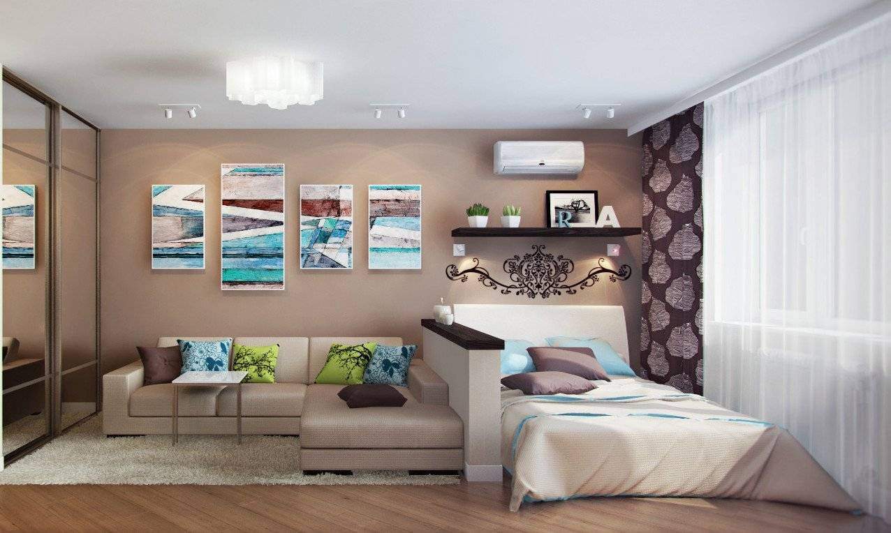 Дизайн комнаты 18 кв.м спальни-гостиной с диваном в середине комнаты