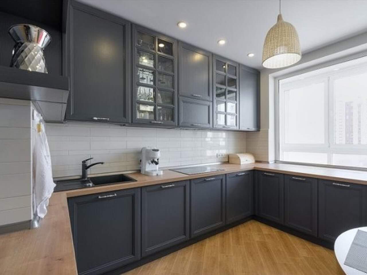 Серая кухня с деревянной столешницей