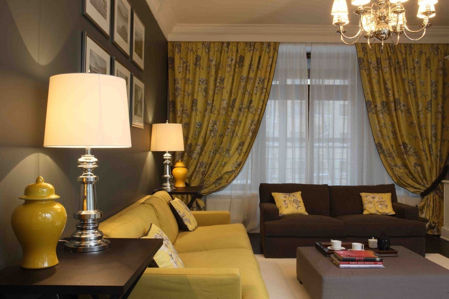 Желтые шторы в интерьере гостиной