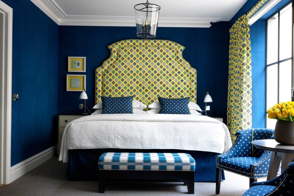 Синие стены в интерьере спальни