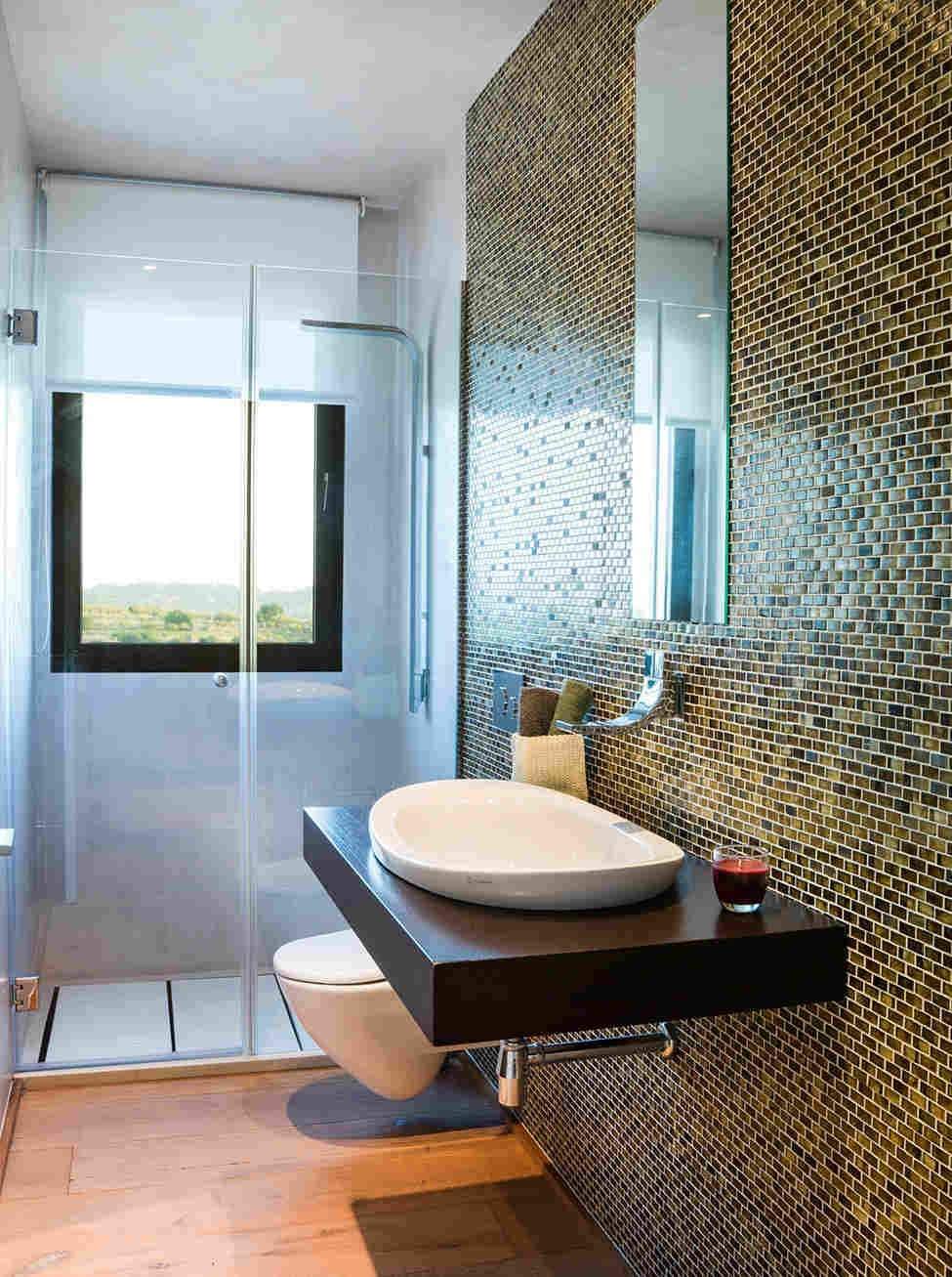 Маленькая ванная с душевым уголком камень дерево