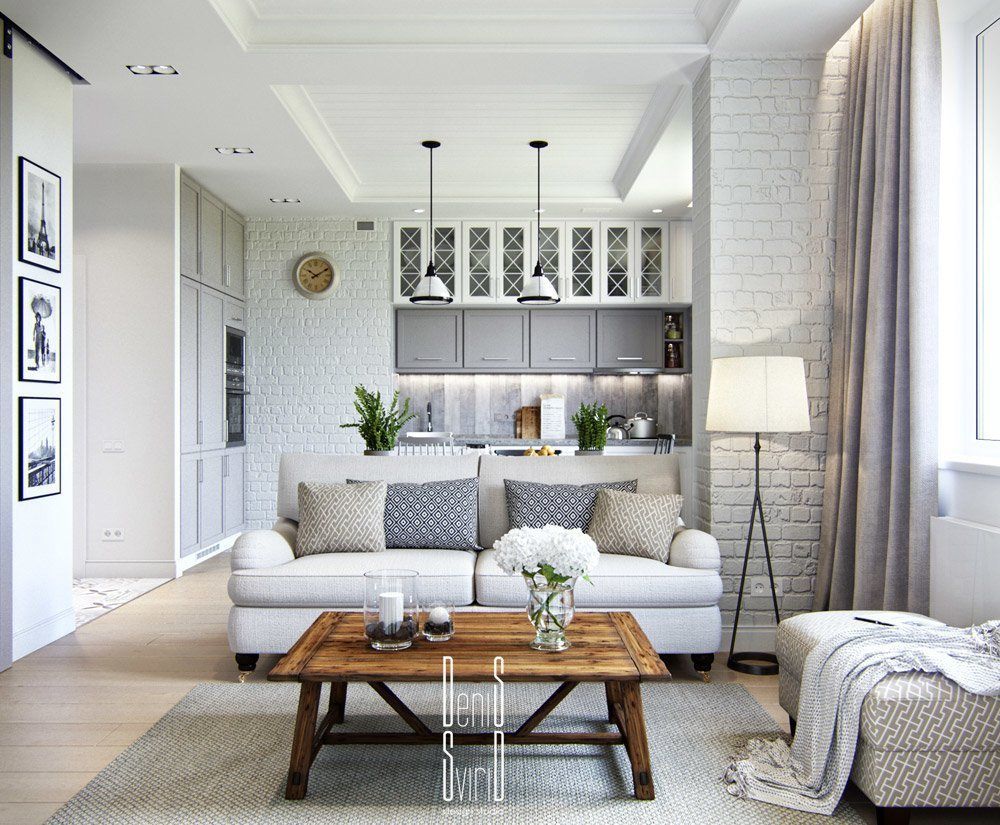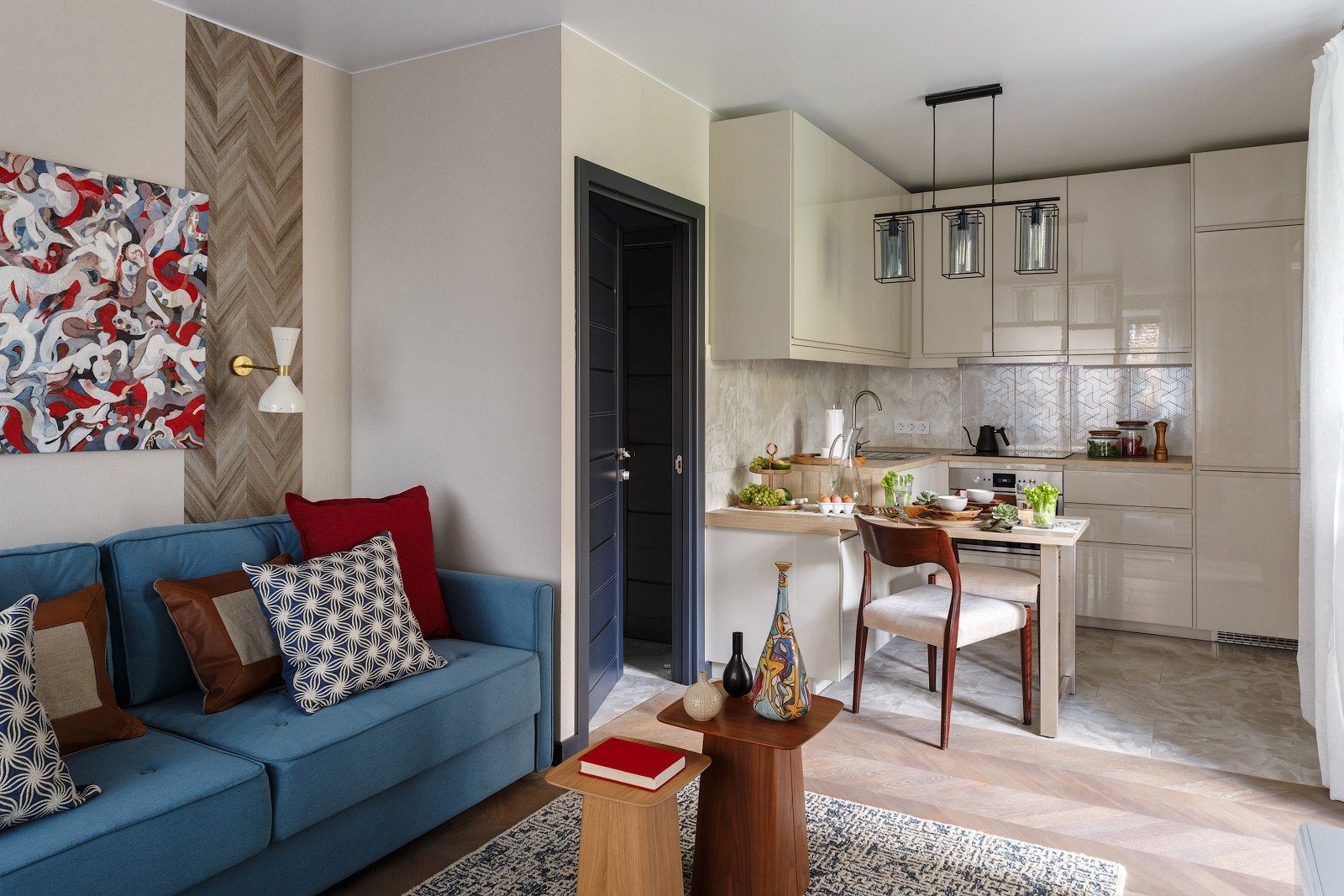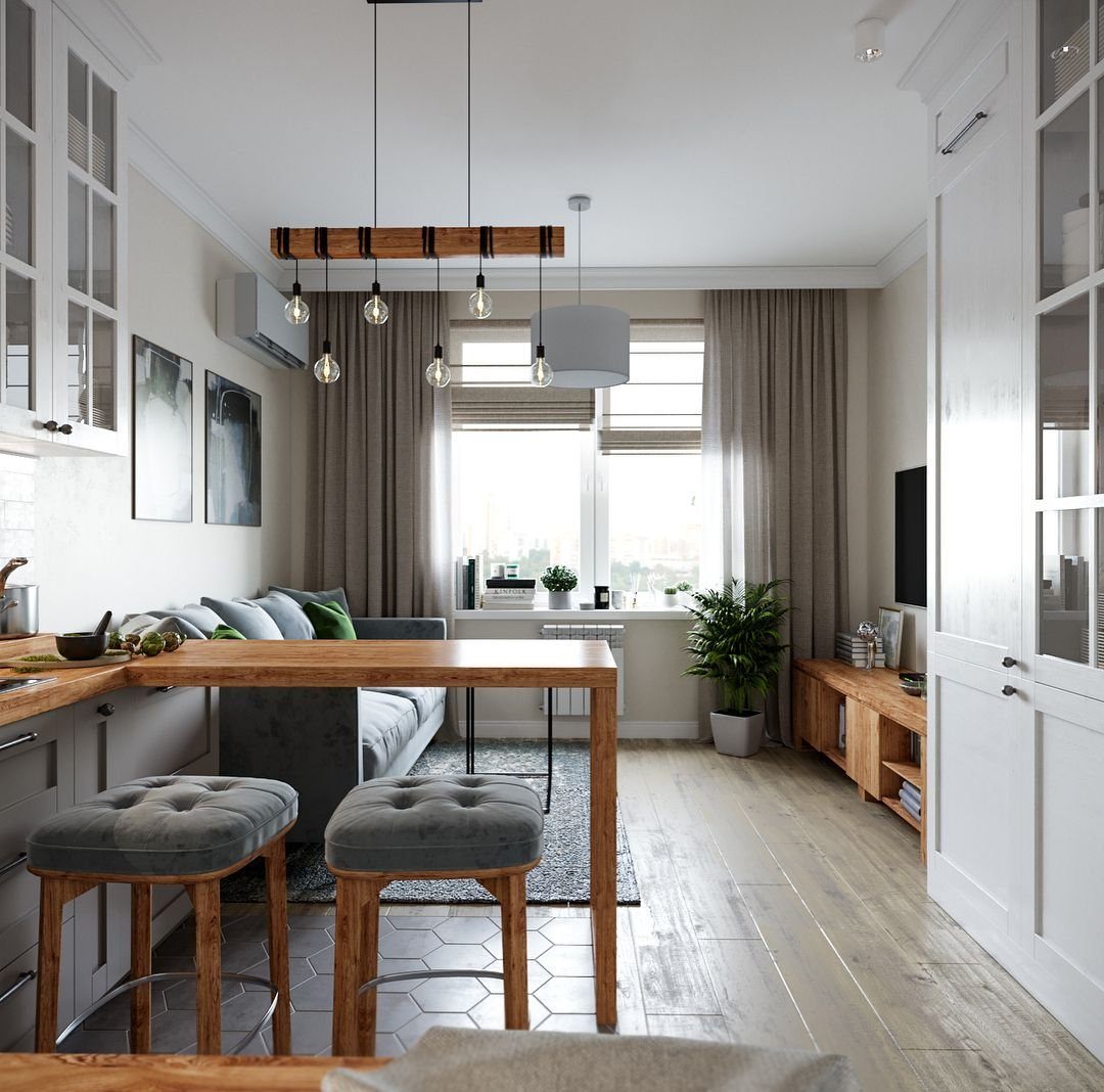 Дизайн кухни-гостинной квадратной 30 кв.м