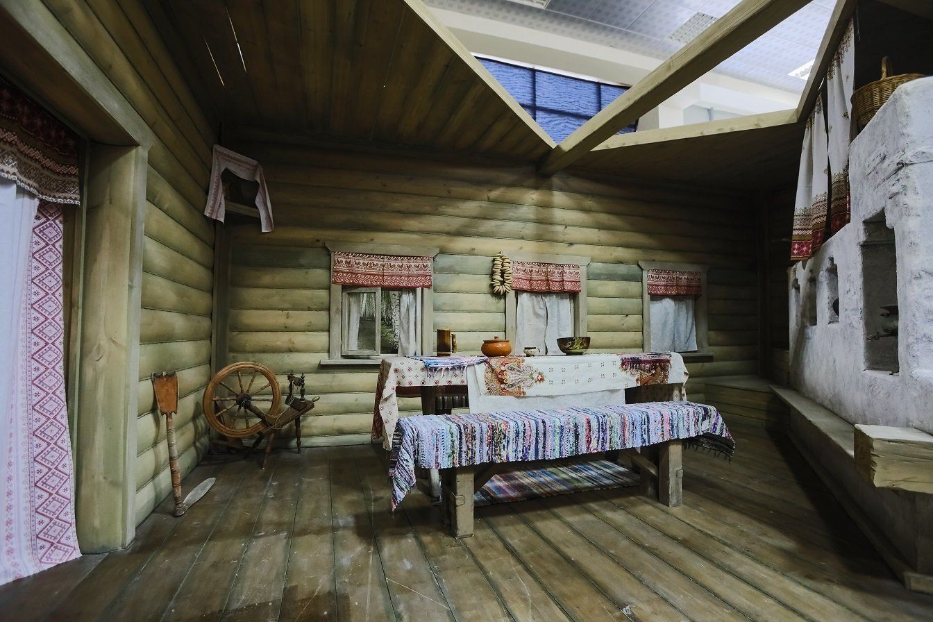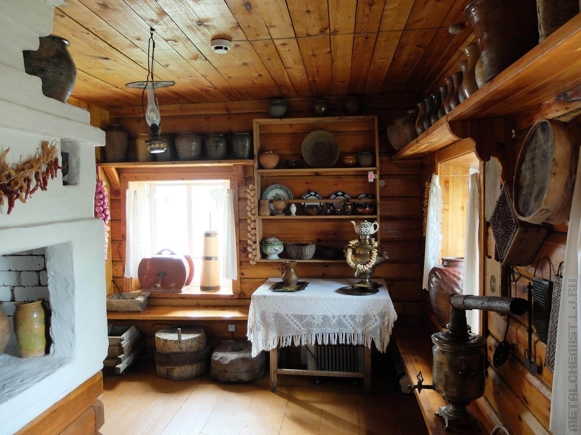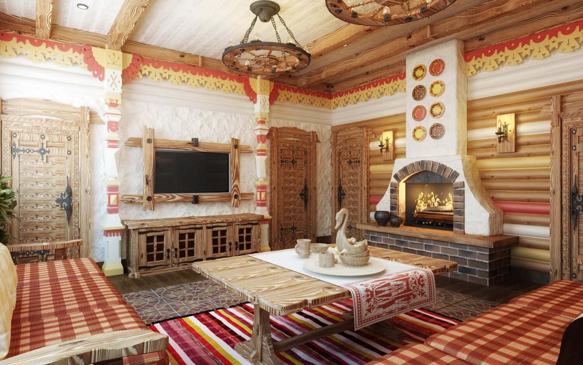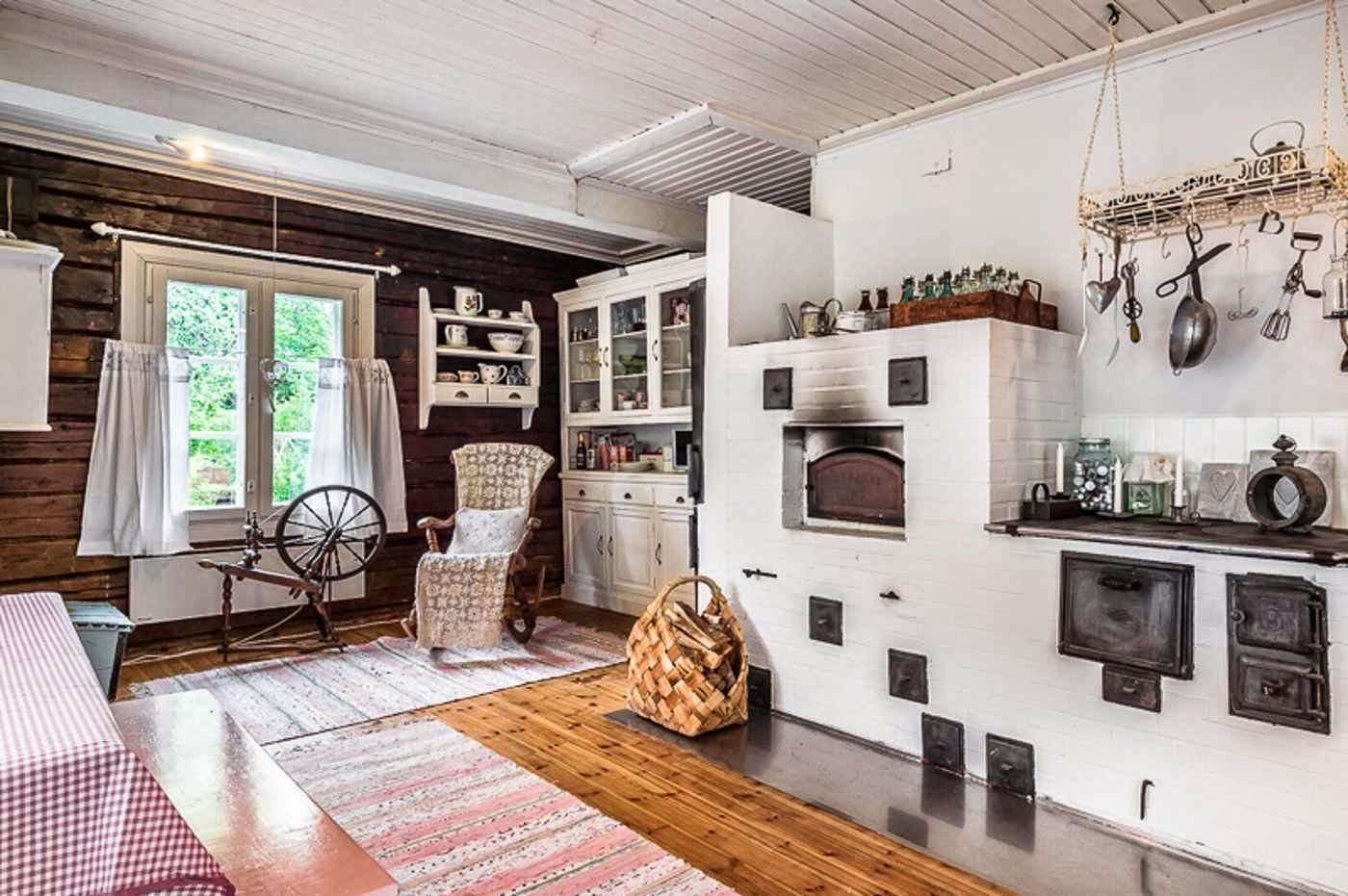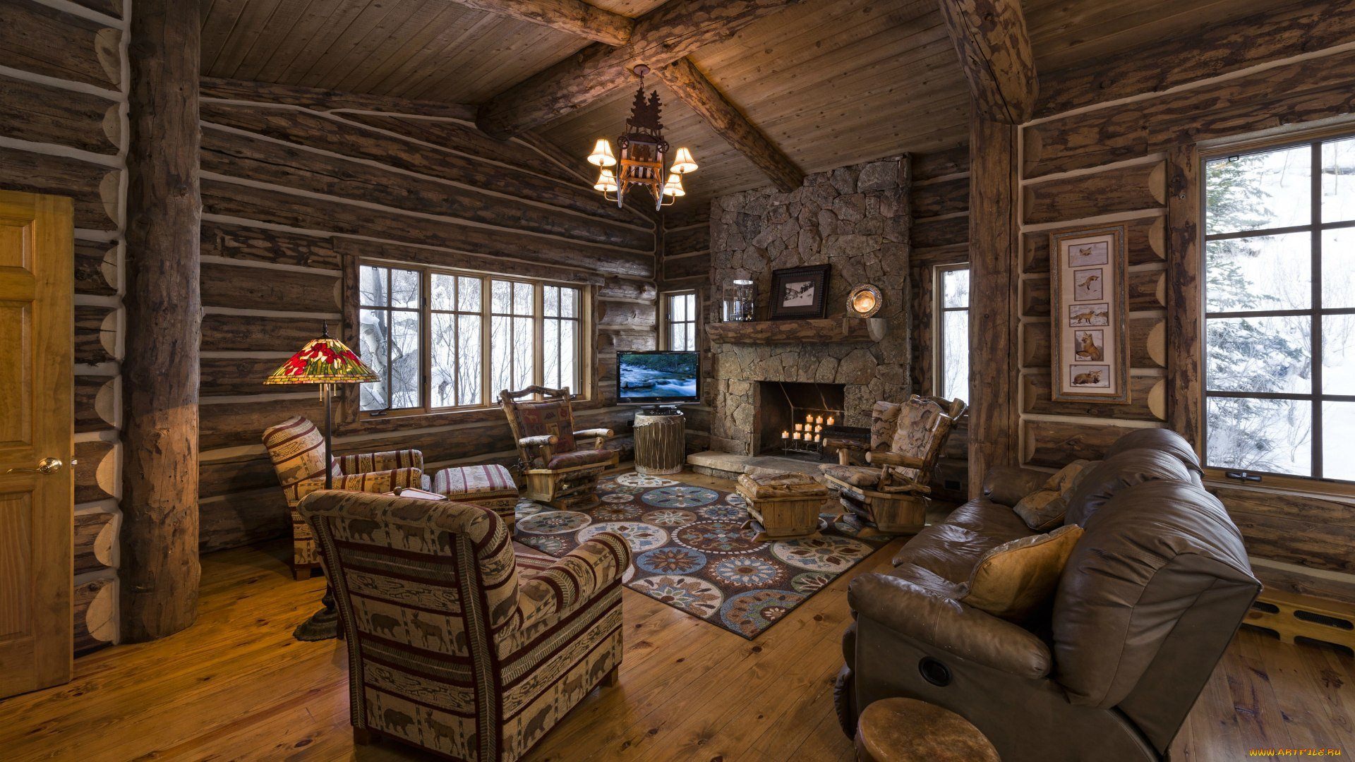 Интерьер спальни в бревенчатом доме в деревенском стиле