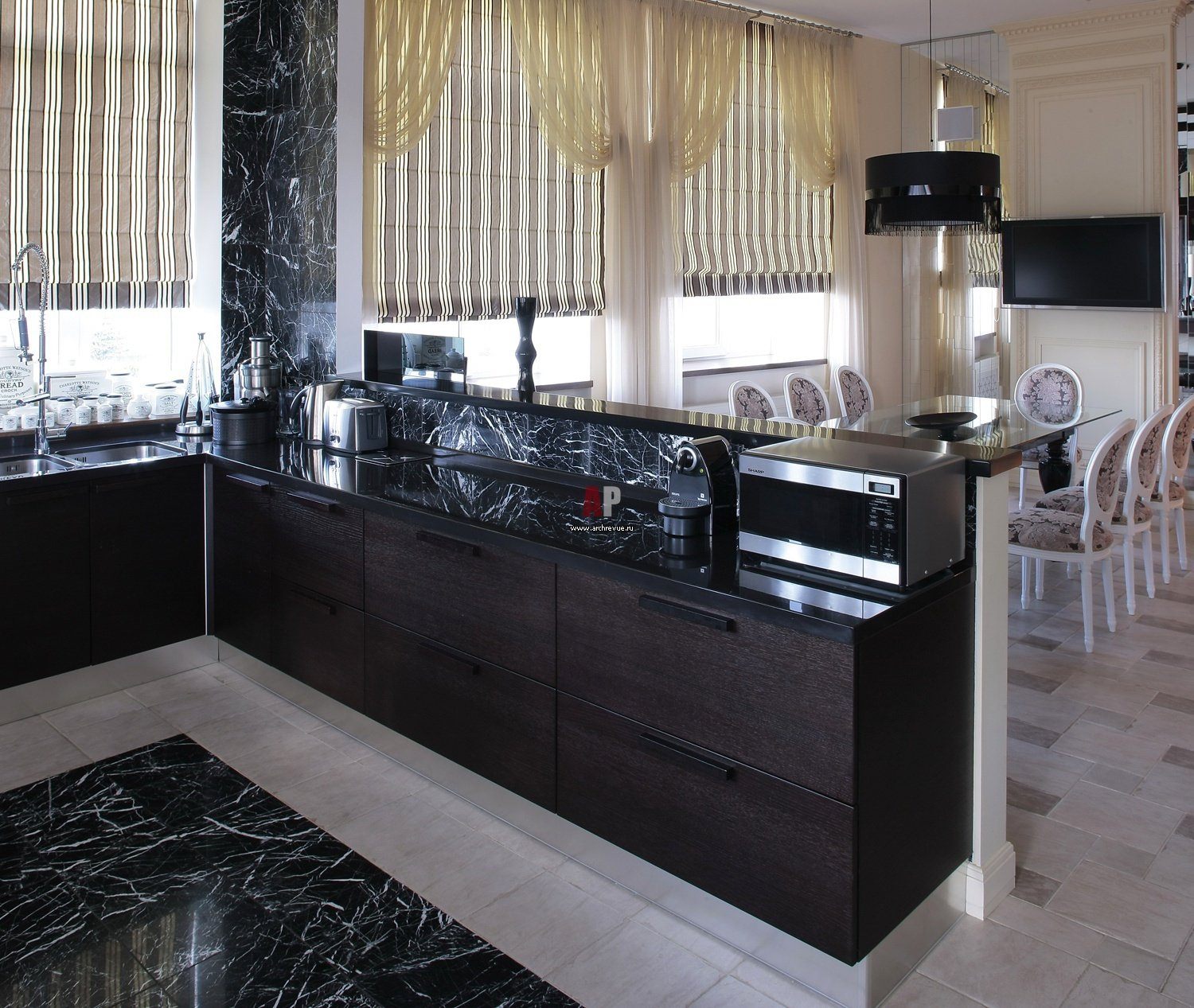 Кухня гостиная с мраморным полом