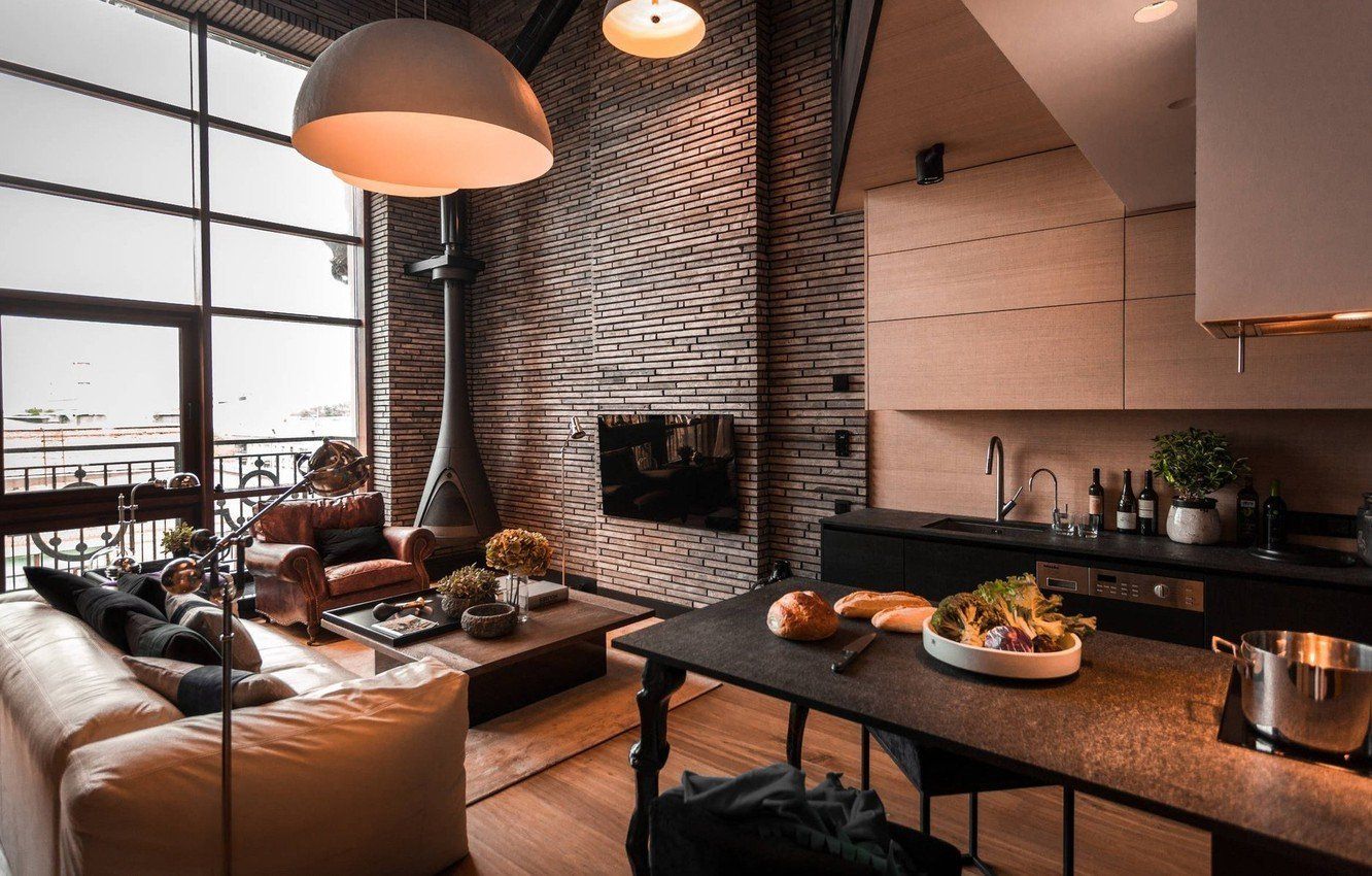Кухня гостиная с камином лофт