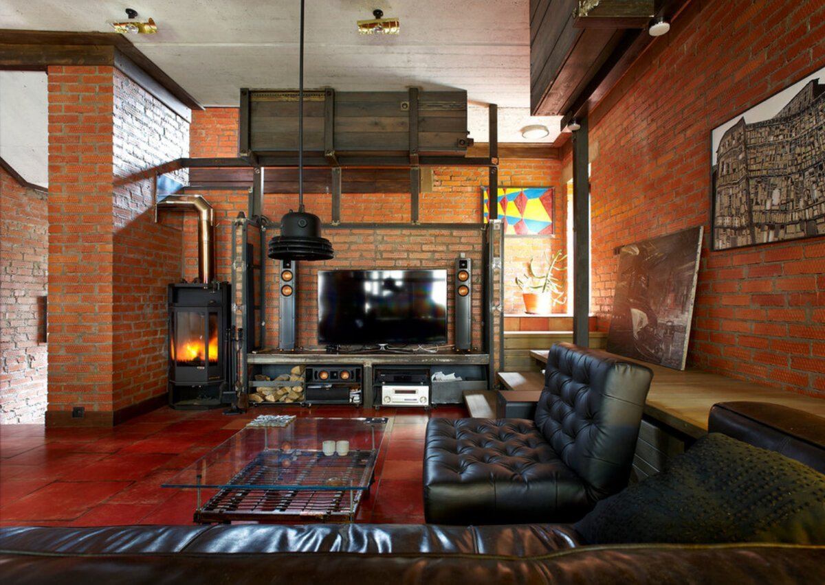 Гостиная в стиле лофт с камином