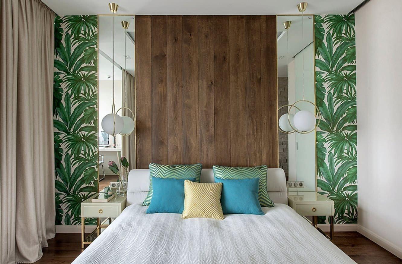 Интерьер спальни с зелеными листьями