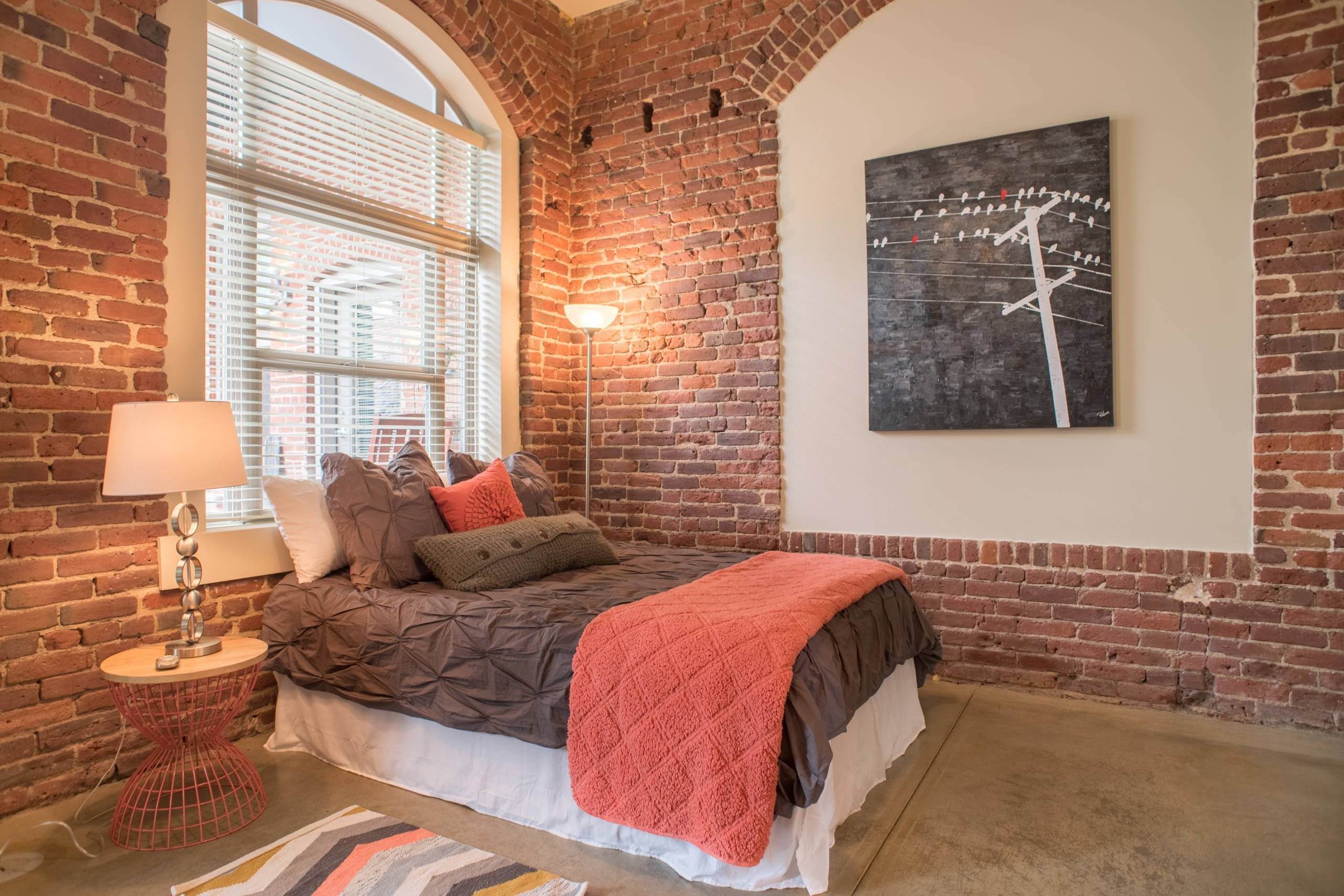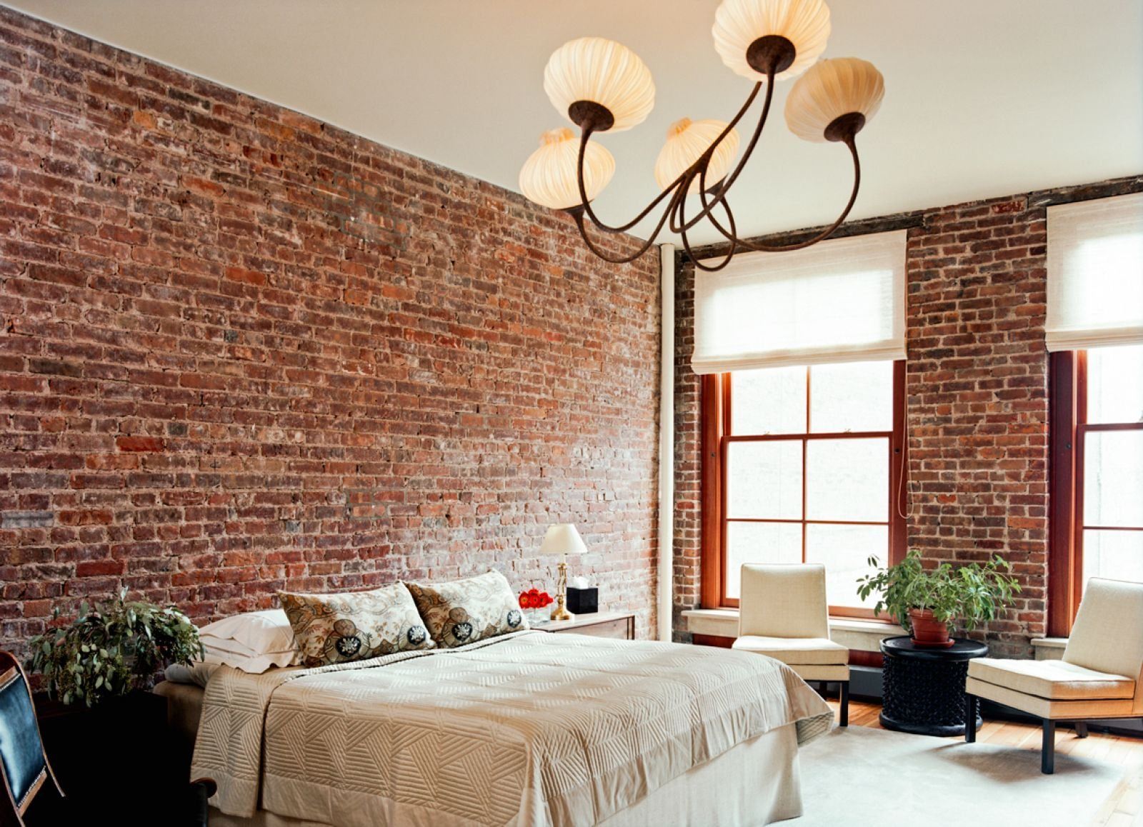 Красный кирпич в интерьере спальни