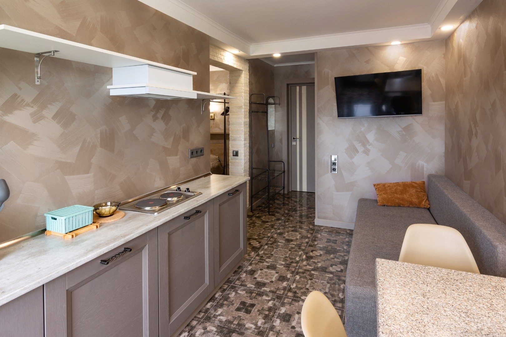 Декоративная штукатурка в гостиной совмещенной с кухней