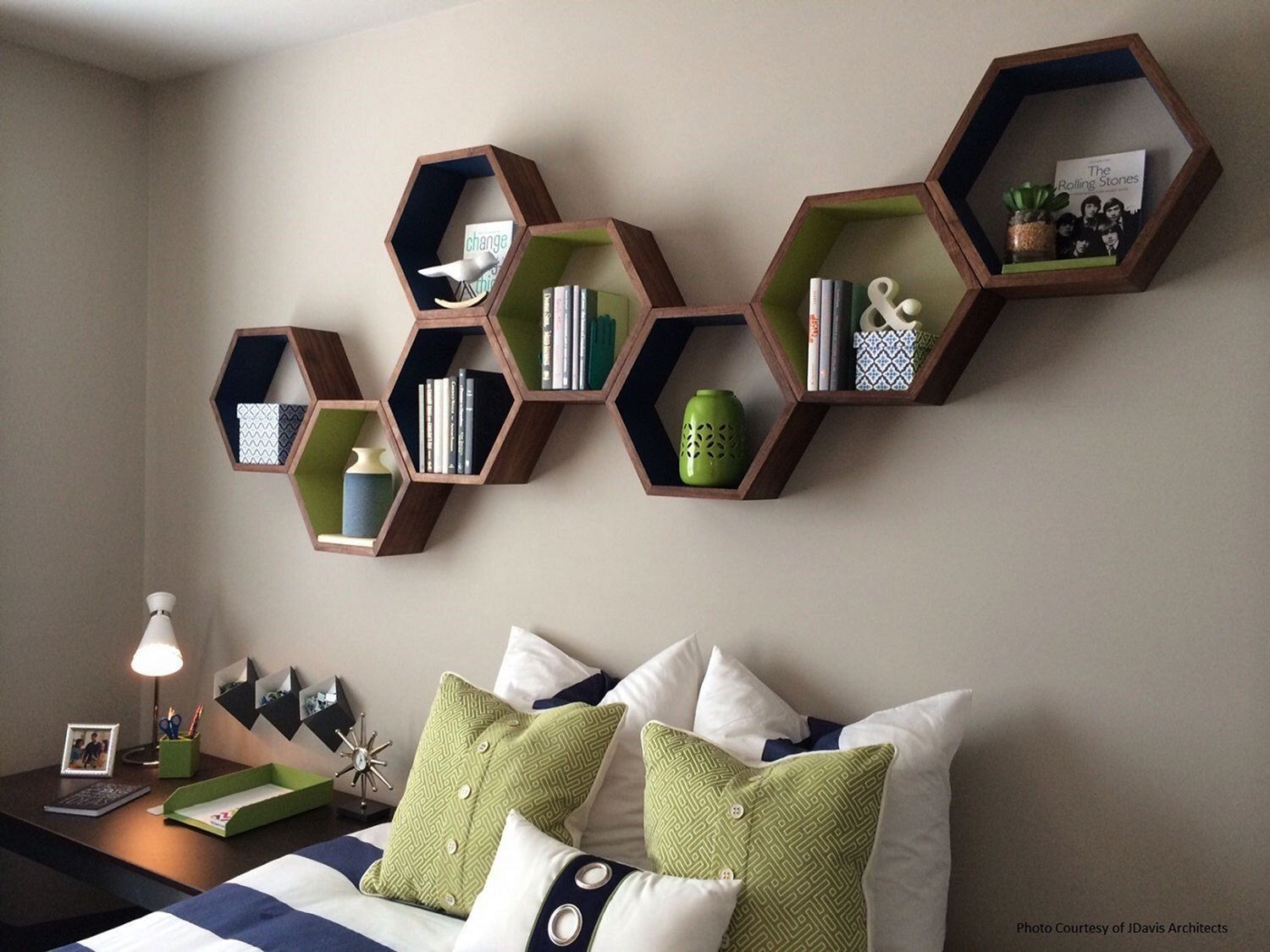 Полки соты в интерьере гостиной
