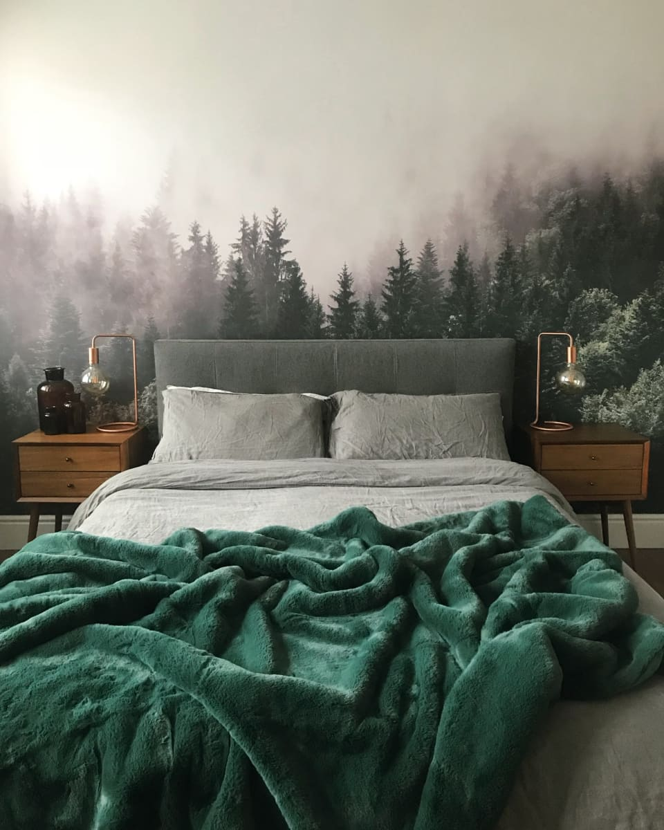 Спальня в изумрудно бежевом цвете с изумрудными шторами