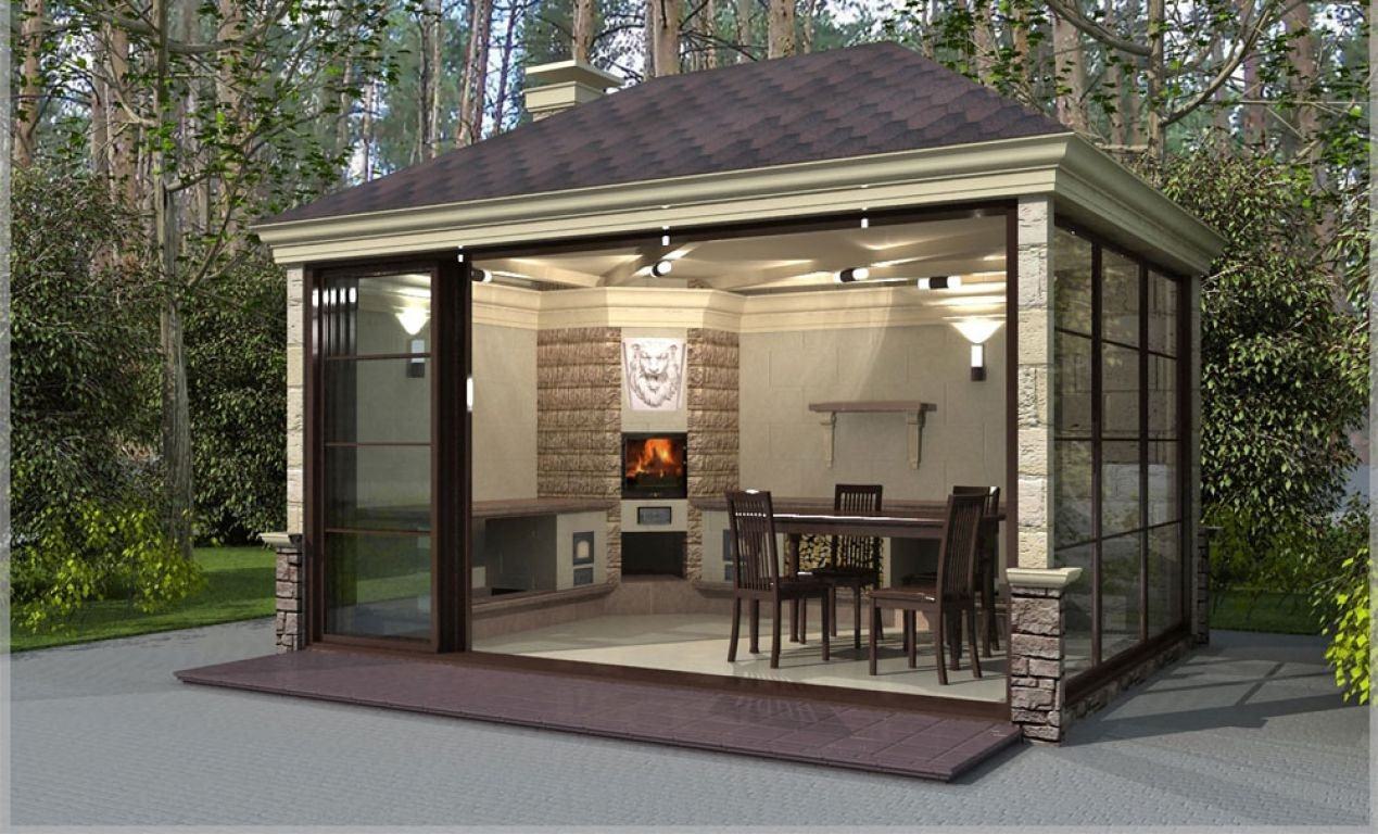 Крытая беседка застекленная с мангалом и барбекю 4х6