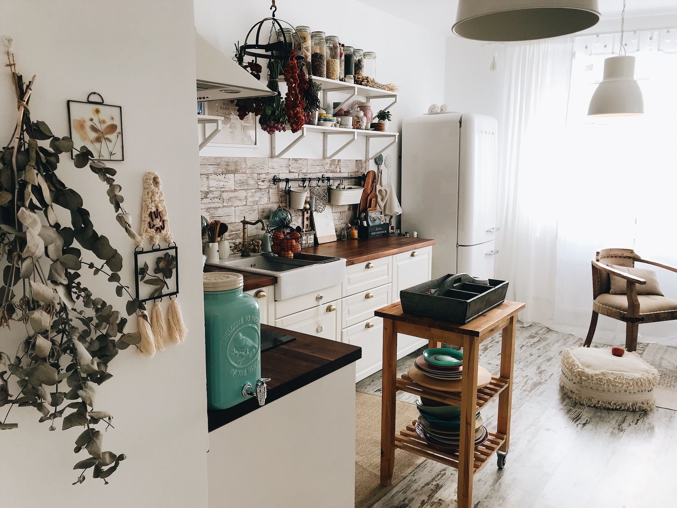 Дизайн кухни без верхних шкафов совмещенной с гостиной