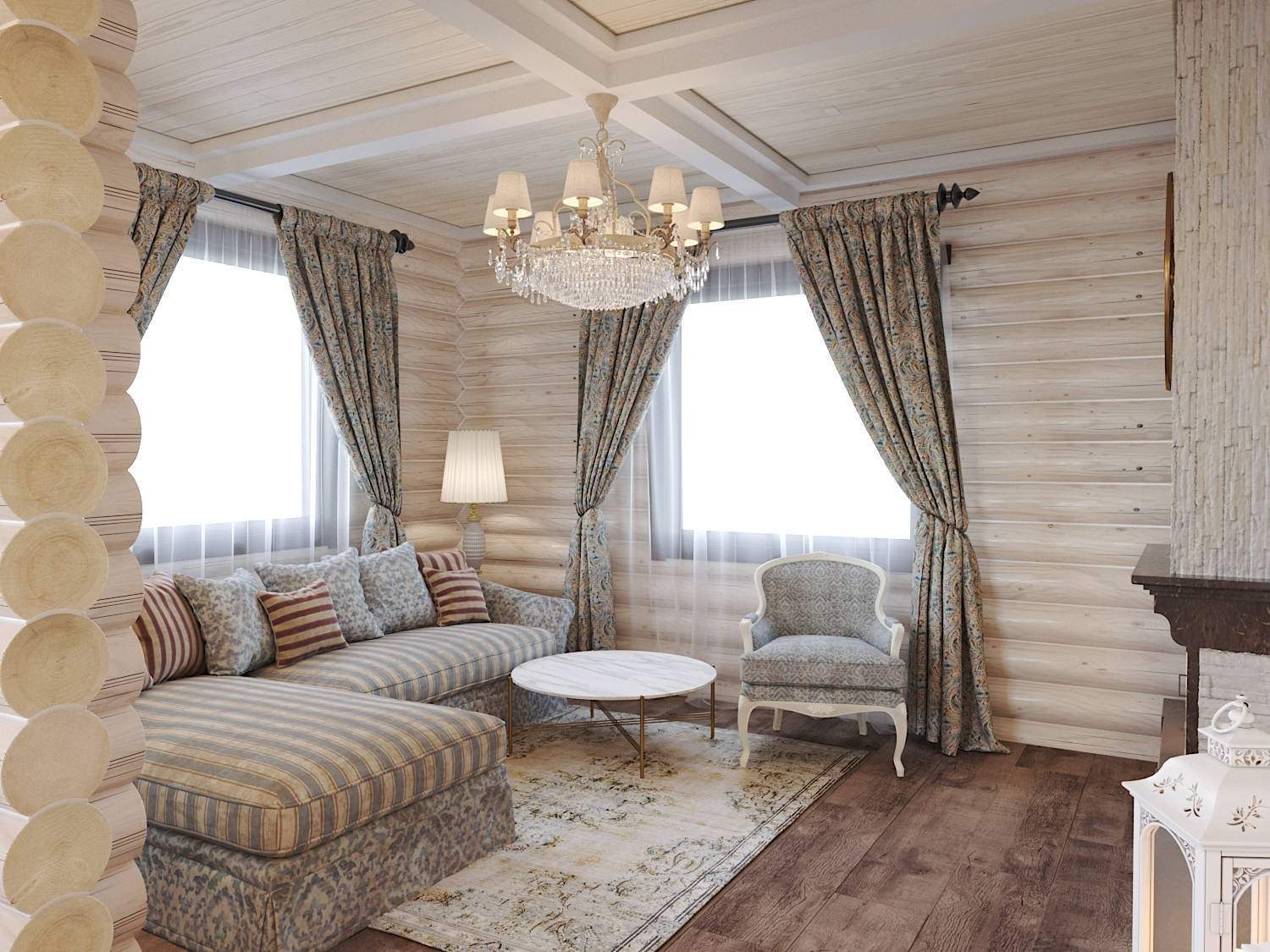 Шторы в гостиной в деревянном доме