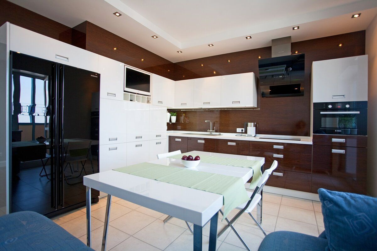 Двухуровневые натяжные потолки на кухне прямоугольная кухня