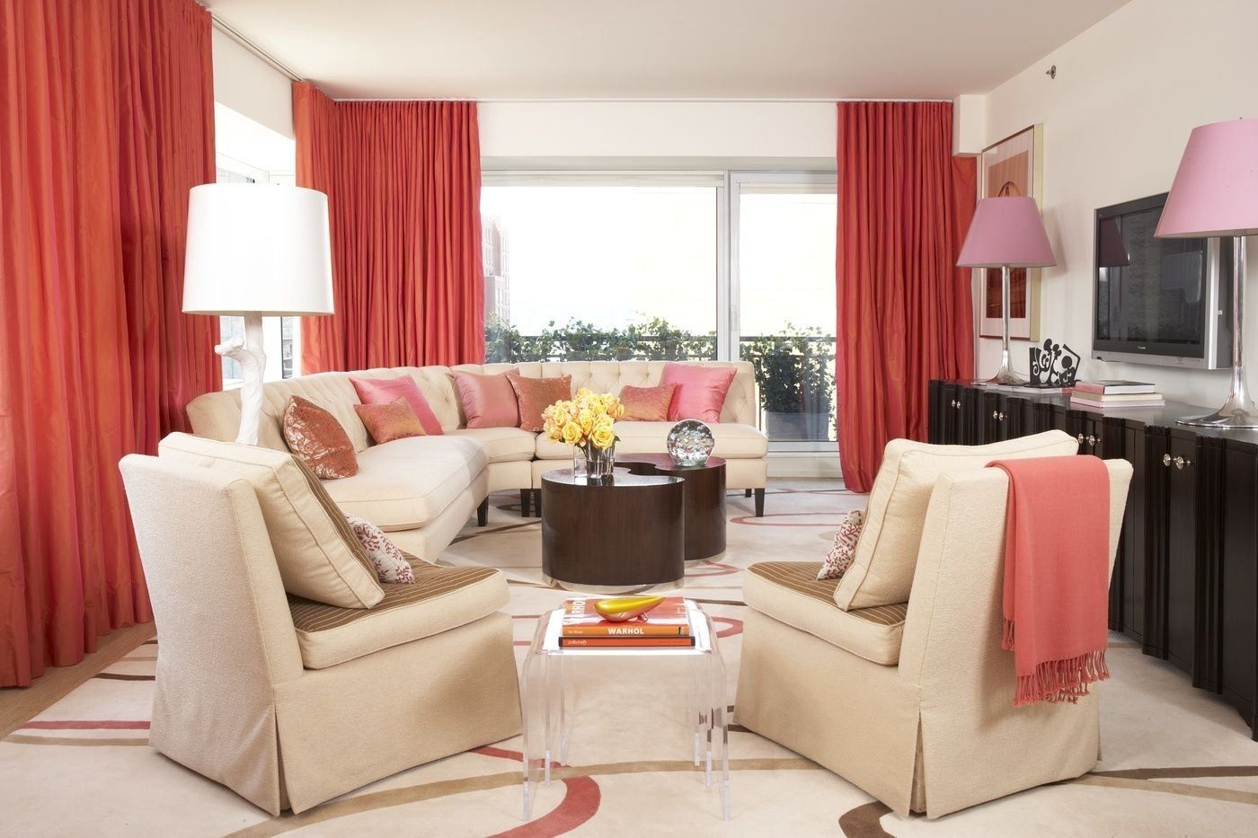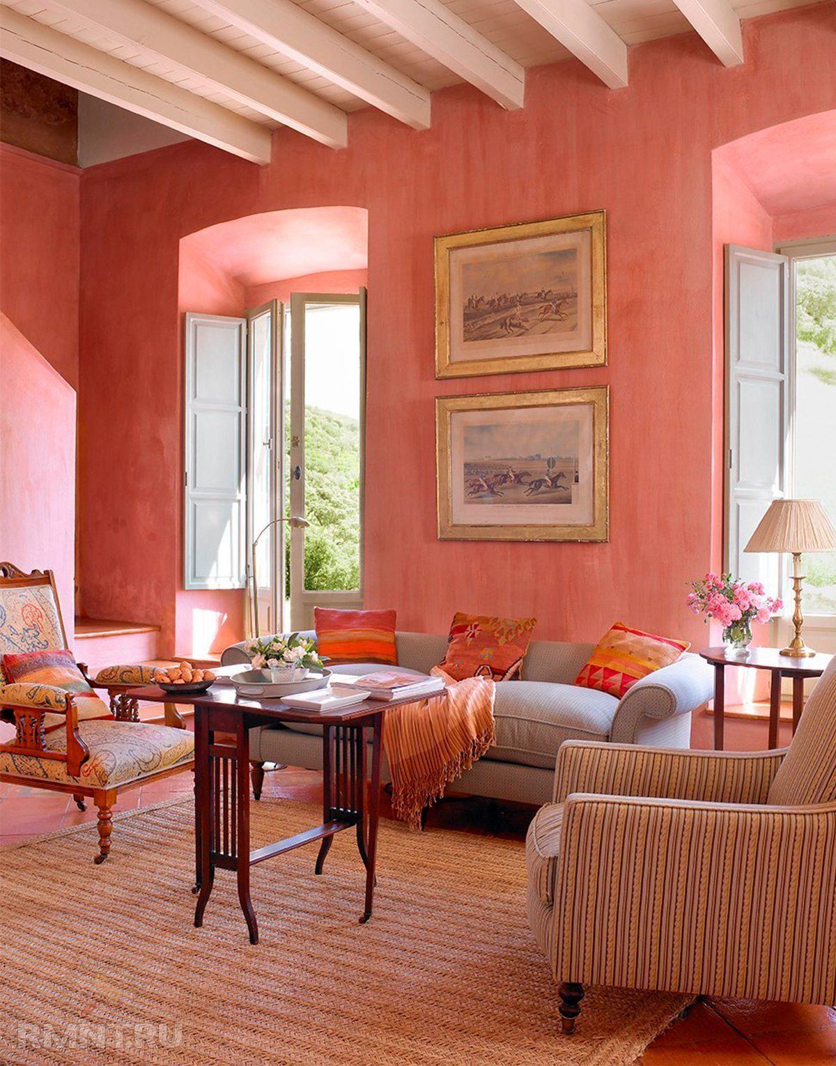 Коралловый цвет в интерьере гостиной