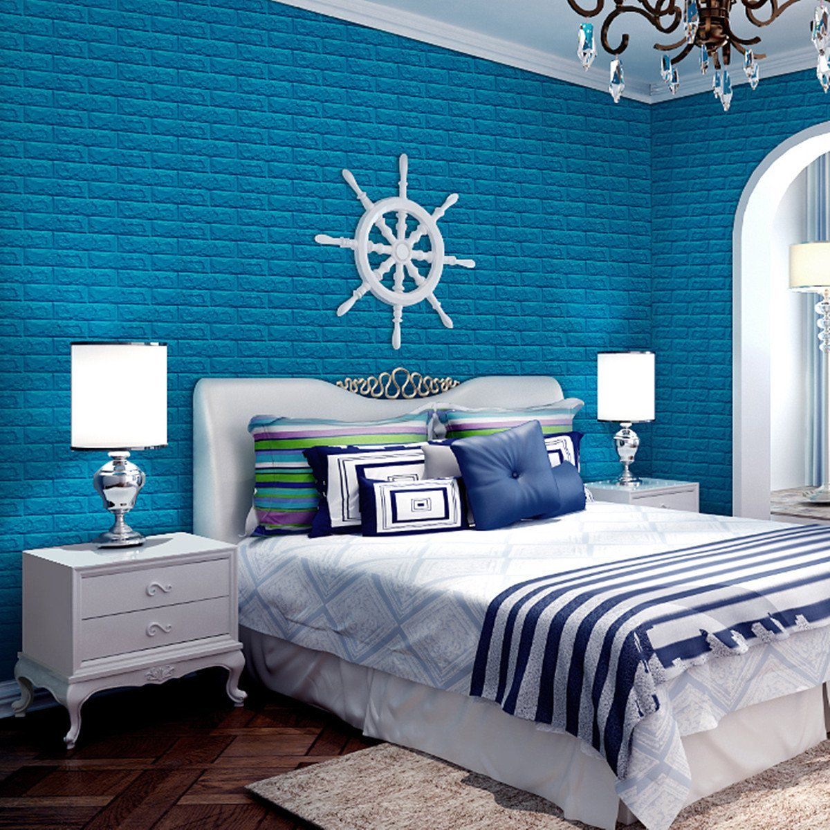 Синие обои в интерьере спальни