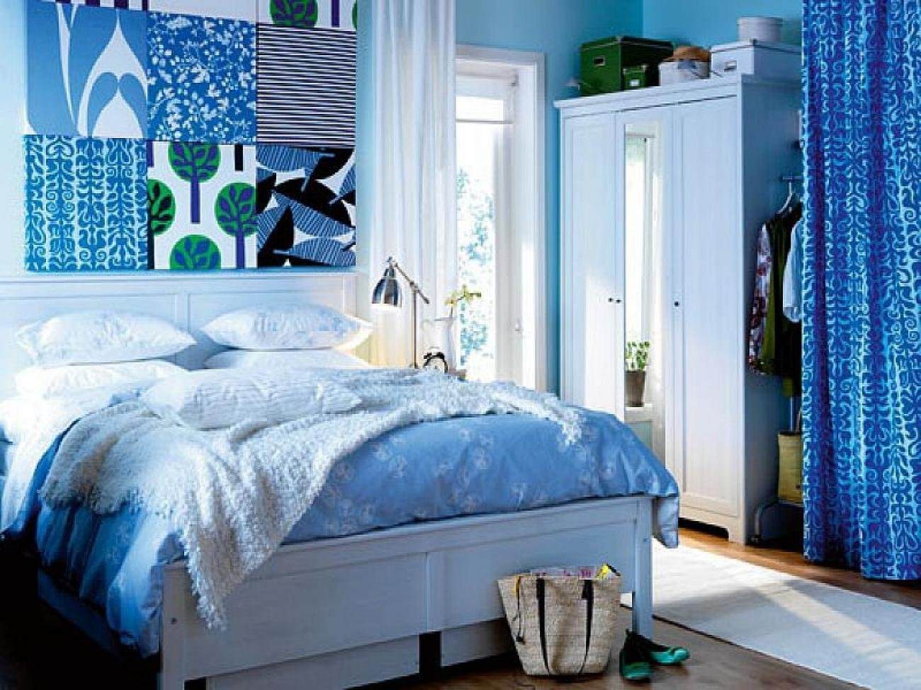 Синяя спальня с белой мебелью