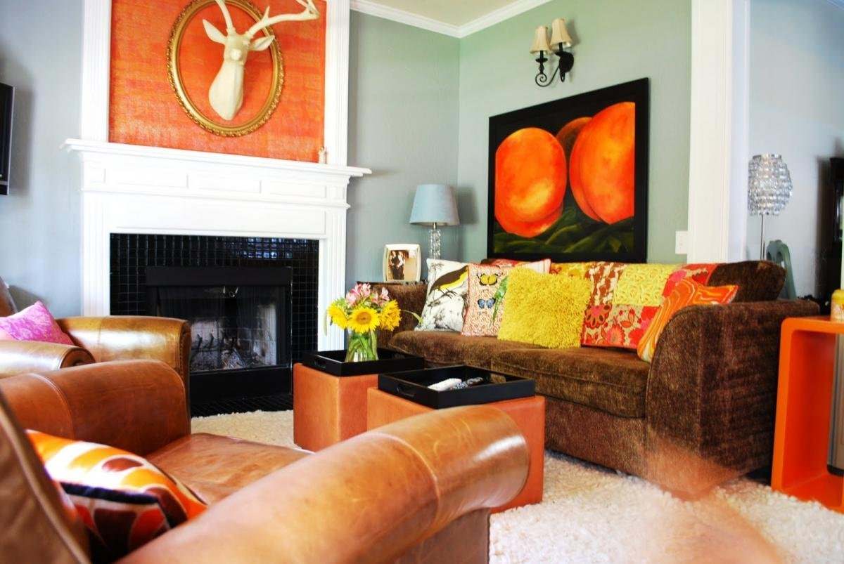 Оранжевый диван в интерьере гостиной сочетания с камином