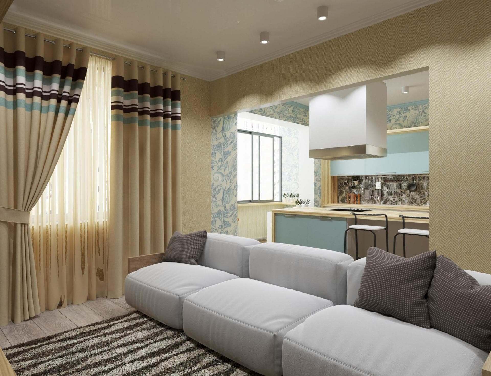 Шторы в гостиную совмещенную с кухней