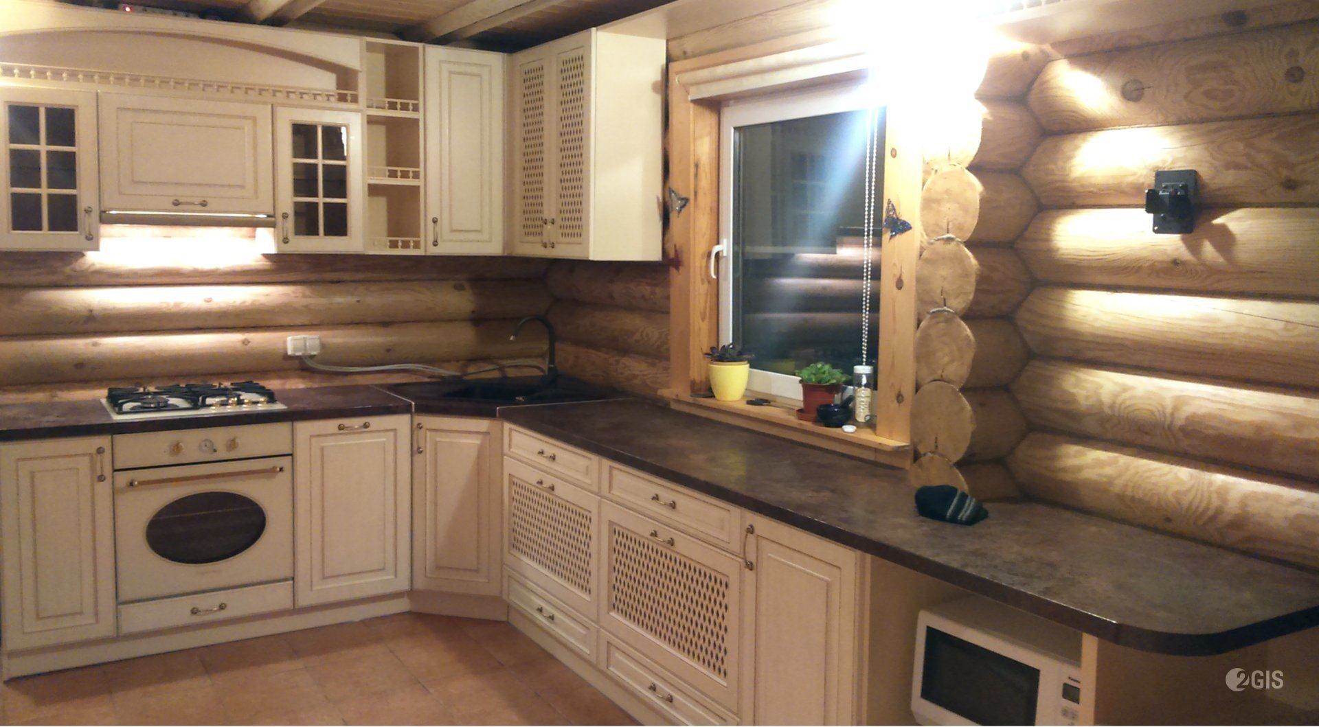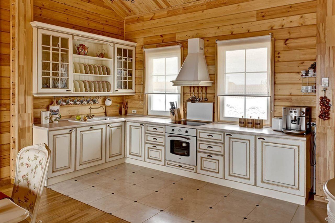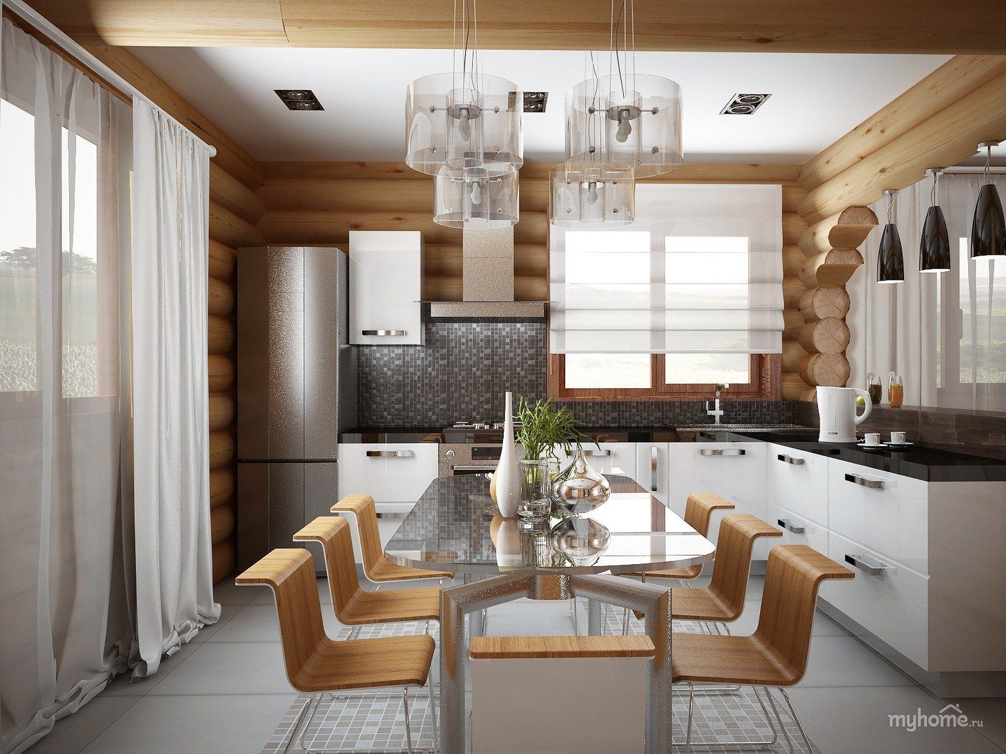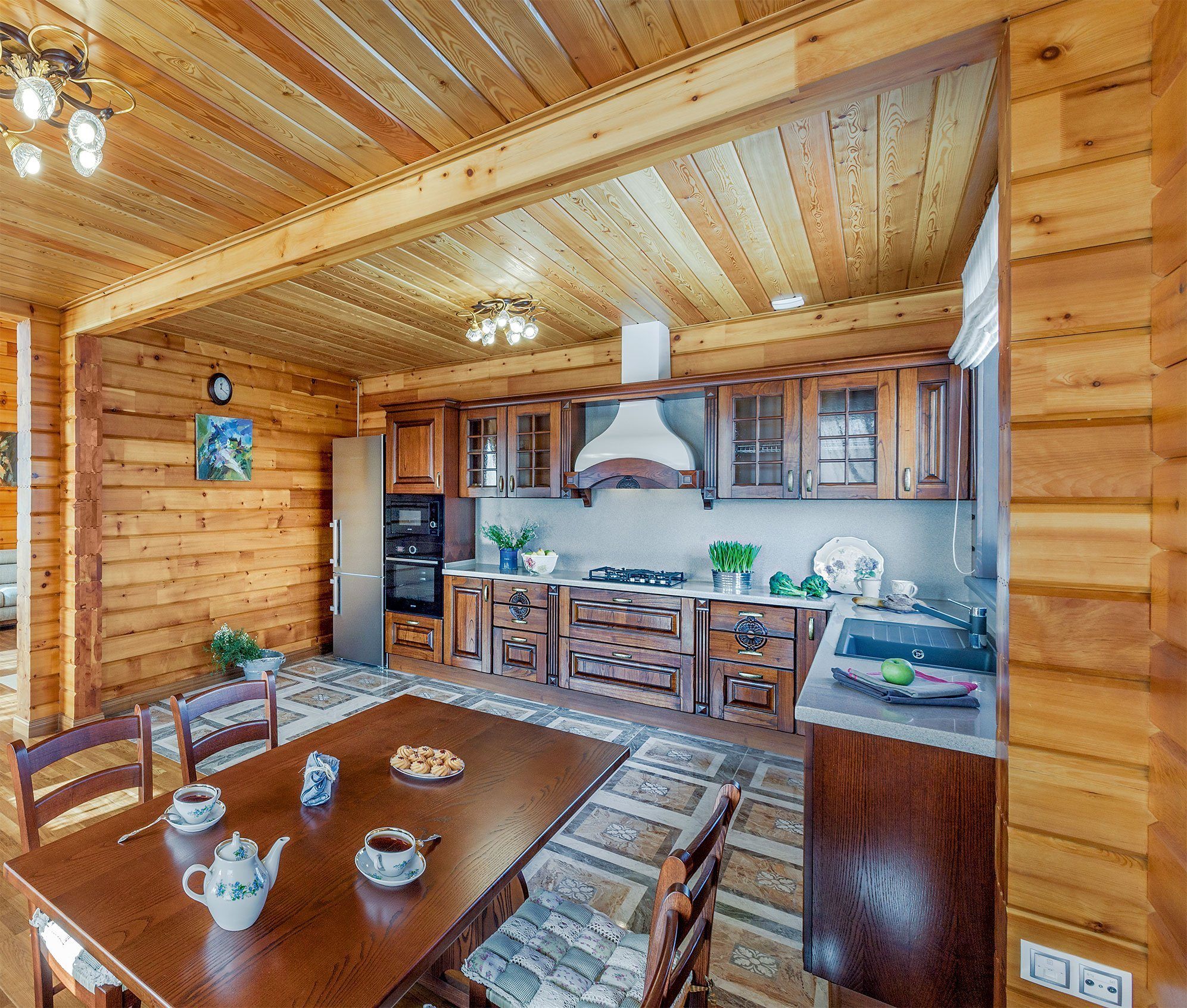 Интерьер кухни в деревянном доме из оцилиндрованного бревна