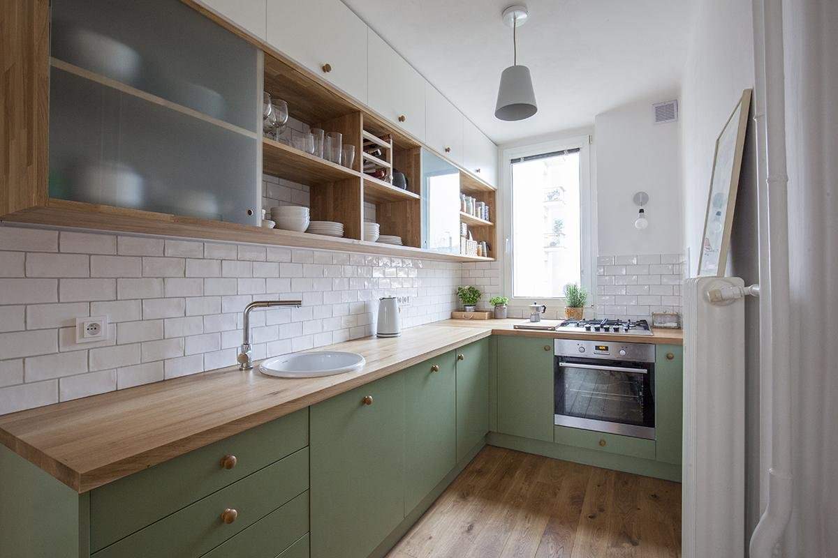 Кухня с зеленой стеной и деревянной столешницей
